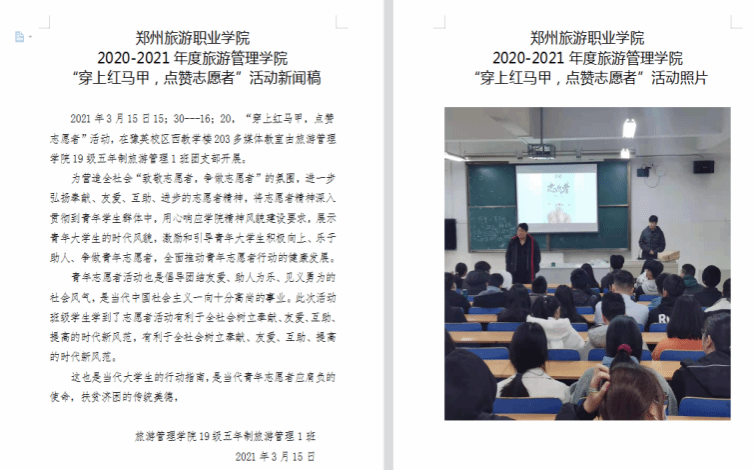 2020年支部成员参与旅游管理学院“三全育人”第十五届旅游文化艺术节获得优秀学团活动表彰。支部参与旅游管理学院宿舍美化大赛荣获第一名,其中4A219宿舍荣获校级三星级宿舍。