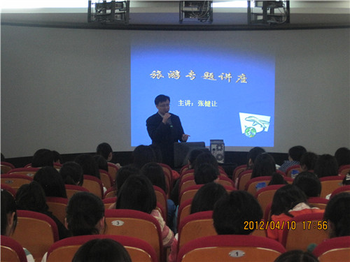2012年4月10日下午4点,旅游管理系艺语社和旅游协会共同主办的 “旅游专题讲座”在西教学楼3D情景模拟室成功举办。此次讲座特邀我系资深的张楗让老师为同学们授课。