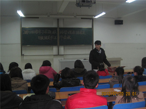 2012年02月20日晚7点半,旅游管理系团总支在新教学楼203多媒体教室召开11级全体团支书工作会议,此次会议主要由旅游管理系团总支办公室主任余付宝主持。