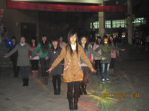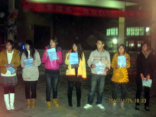 2011年11月28日下午5点,旅游管理系团总支在西教学楼报告厅前成功举办“舞夜CLUB”周末舞会,这次舞会由“粉红女郎”护肤美容店、“银座”发型设计和“疯狂烤翅”等提供赞助。