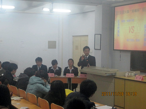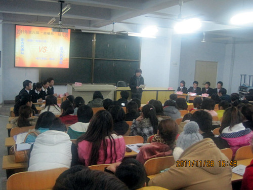 2011年11月28日下午4点,第六届“晨曦杯”辩论赛系部循环赛第七场在东教学楼二楼北阶梯教室开赛,旅游管理系参加了此次比赛,系指导员余高峰老师出席了本次辩论赛。