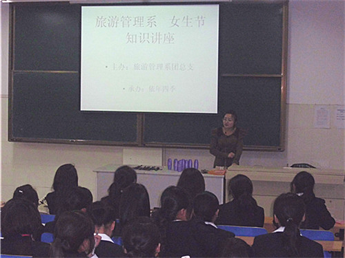 关注社会,关注女孩。旅游管理系社会实践部于2011年4月14日晚7:30在西教学楼203阶梯教室举办了一场由李素珍老师主讲的女生节知识讲座。此次讲座主要由10级旅游管理系的女生参加。