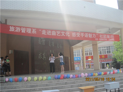 为迎接社团展示月,旅游管理系星星曲艺社与手语社于2011年5月19日下午4:00在西报告厅前举办了以“走进曲艺文化,感受手语魅力”为主题的社团展示活动。