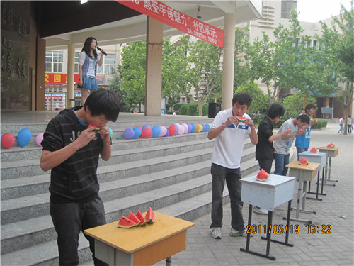 活动由一曲动听的葫芦丝奏乐拉开了序幕,接着还有手语展示、脱口秀,吹箫等活动,内容丰富多彩。其中,最精彩的要数手语展示了,那优美的手势与整齐的动作引起了台下观众的阵阵掌声,把现场的气氛推向了高潮。在这精彩节目之间,同学们还可以参加吃西瓜比赛,此次比赛分男女两组,参赛选手分别站在已经排放有西瓜的桌子前,等待主持人说开始,然后五名选手开始吃西瓜,先吃完者为得胜者。比赛很是激烈,引得观众们的热烈欢呼为参赛者们加油。活动经过渐进一个小时圆满成功了。