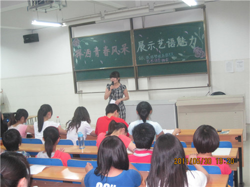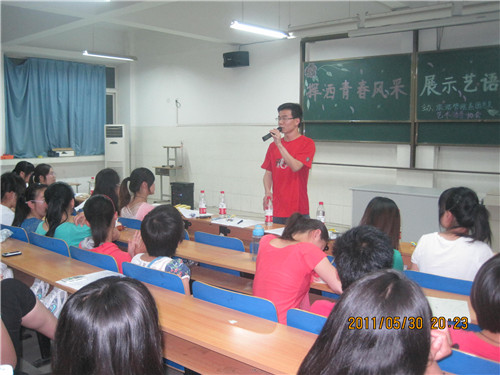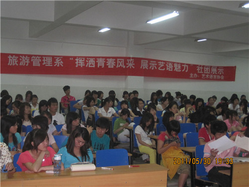 挥洒青春风采,展示艺语魅力。旅游管理系艺术语言协会于2011年5月30日晚7:00在新教学楼203教室举行社团展示活动,担任本次活动的评委有牛亚飞老师和王晓庆老师。