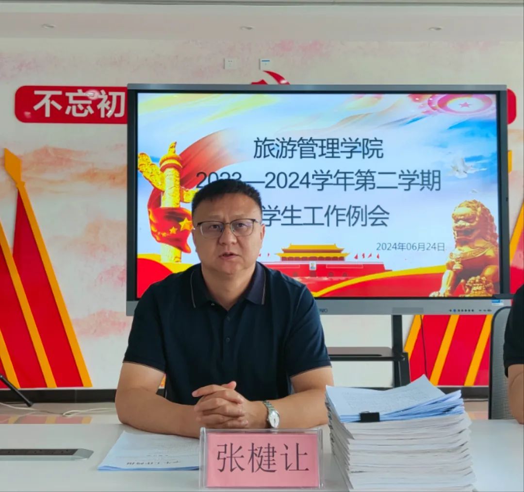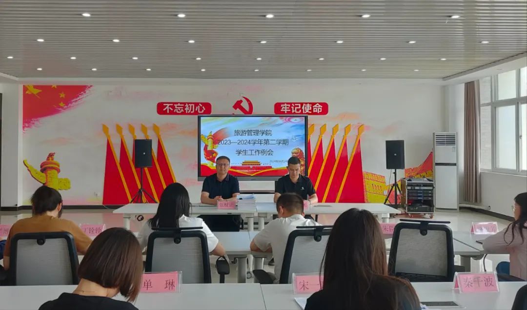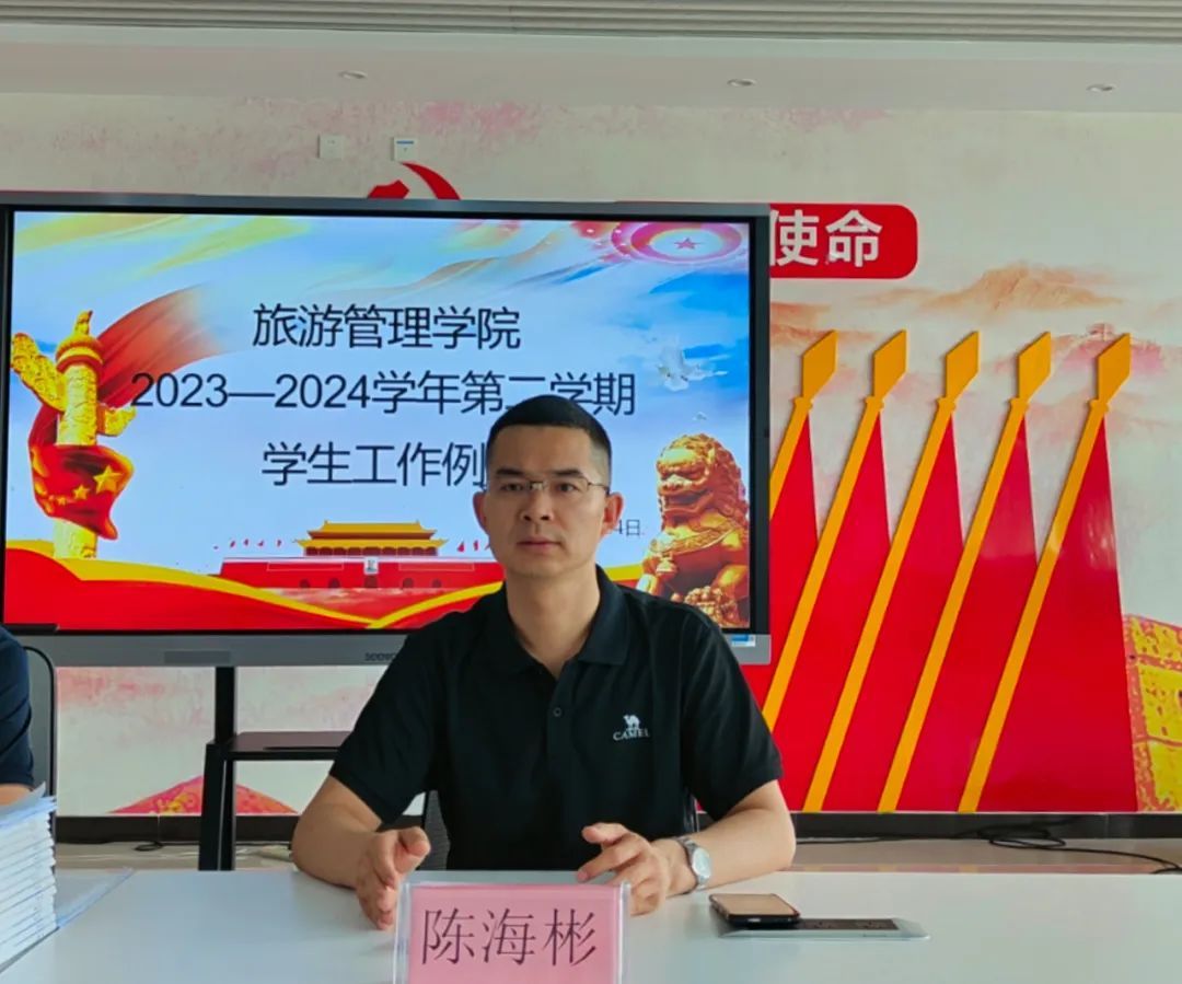 6月24日上午,旅游管理学院在5A党建馆召开2023-2024学年第二学期第六次学生工作例会,党总支书记陈海彬,党总支副书记张楗让,以及全体专兼职辅导员参加会议,会议由张楗让主持。