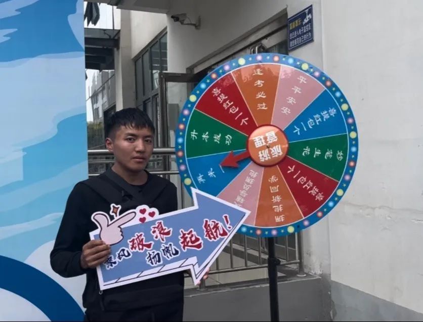 在学院大门前,旅管学院精心布置了一系列吸引眼球的迎新展板,并设置了趣味盎然的抽奖活动,新生们纷纷参与其中,转动转盘,为即将开启的大学生活增添了一份惊喜。