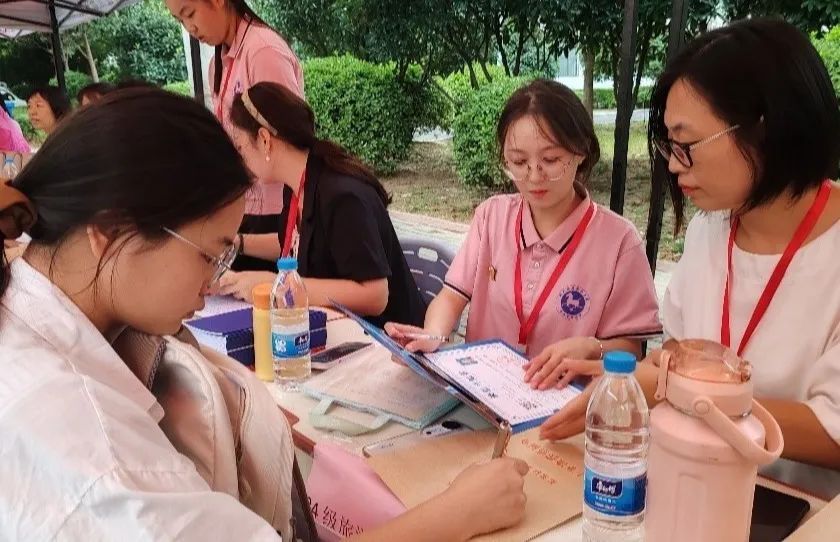 旅游管理学院的志愿者们在校园各处忙碌着,他们在校门口热情迎接,细心照看行李寄存,于报到处耐心引导,为新生指引入住宿舍的路径……