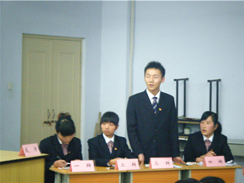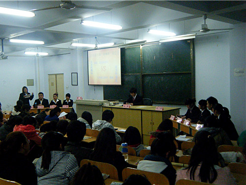 此次辩论赛共分为两场进行。四支代表队分别是酒店管理系、机电系、旅游外语系、旅游商贸系。在主持人精彩的介绍后,比赛正式开始。没有硝烟的战场火药味顿时弥漫起来,在随后的攻辩环节中,各方更是针锋相对。第二场辩题为“知足者是否常乐”的比赛中,我系辩手对阵外语系辩手的环节中,我系三辩赵宇同学言辞幽默风趣,提问绝妙犀利,步步紧逼。现场气氛迅速升温,达到白热化阶段。