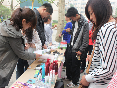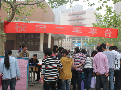 2012年4月18日中午12点,旅游外语系商业协会在西教学楼前举行“校园二手商品交流会”,人来人往的同学纷纷驻足,希望可以淘到自己满意的商品。