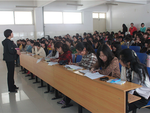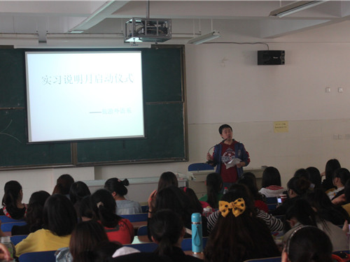 张贺玲主任向大家介绍了今年实习的总体安排和现今的就业政策,并宣布“实习说明月活动仪式”正式启动。随后,荆老师向10级同学详细介绍了全国各地的实习地点,希望同学们能够及时清楚地了解实习信息。同时荆老师告诉同学们大学生怎样选择实习地点,然后就面试问题和公司选人标准做了详细介绍,并强调“不说外语的实习公司我们不去,因为我希望大家学有所用,语言水平能够得到提高”,这番话道出了同学们的心声,赢得阵阵掌声。