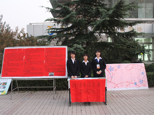 2011年9月22日,旅游外语系团总支在学院体育馆前进行了团委宣传报名活动,具体形式是以展板为主题.并设立咨询处来为新生同学们答疑解惑.