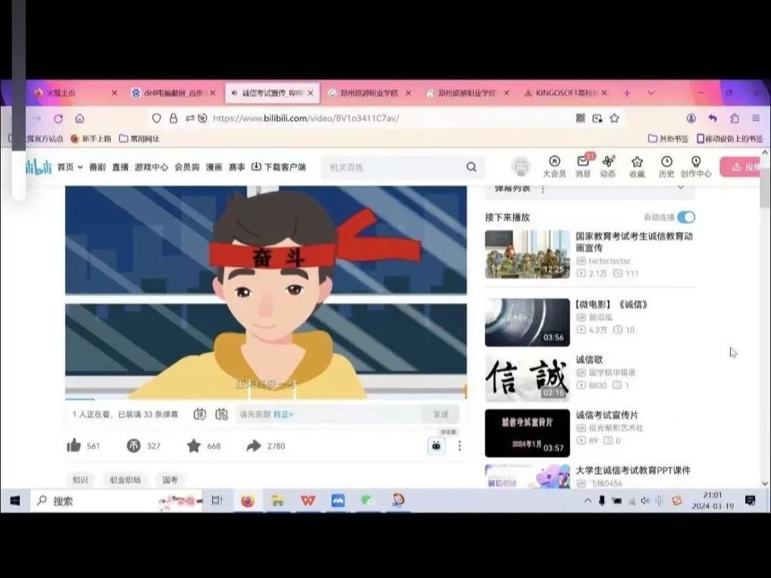 旅游外语学院21级班级在线上召开了诚信考试教育班会。班主任老师带领观看《中华人民共和国刑法修正案(九)》、《教育法》和《国家教育考试违规处理办法》警示教育宣传片等,让学生认识到诚实守信对个人成长的重要影响和考试违规的严重后果,告诫考生切勿触摸考试红线,务必做到认真备考,诚信应考,共建诚信考场。