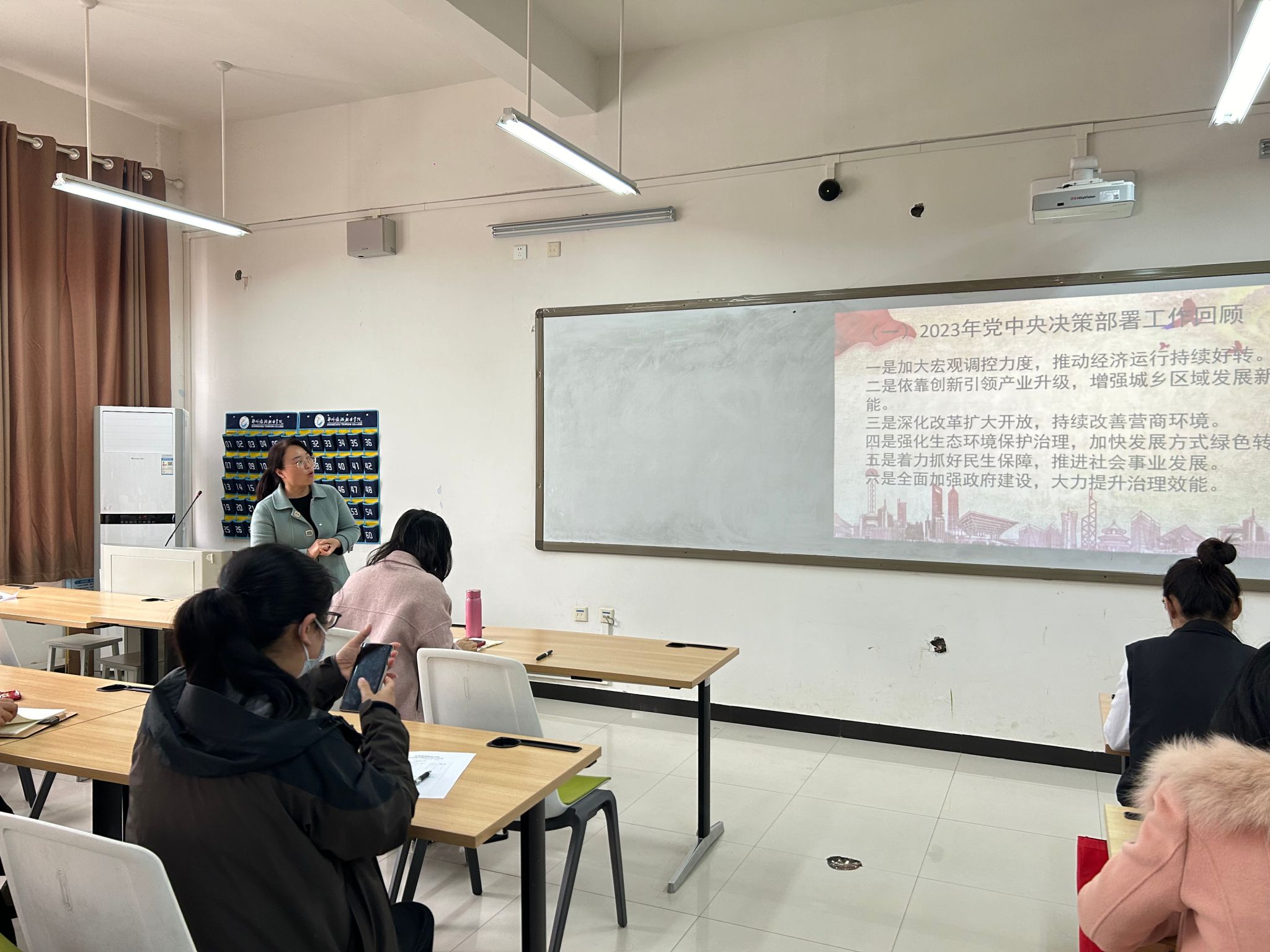 旅游外语学院党总支组织委员徐慧从2023年工作回顾、2024年经济社会发展总体要求和政策取向、2024年政府工作任务等三个方面带领大家学习了2024年政府工作报告,传达了全国两会精神。