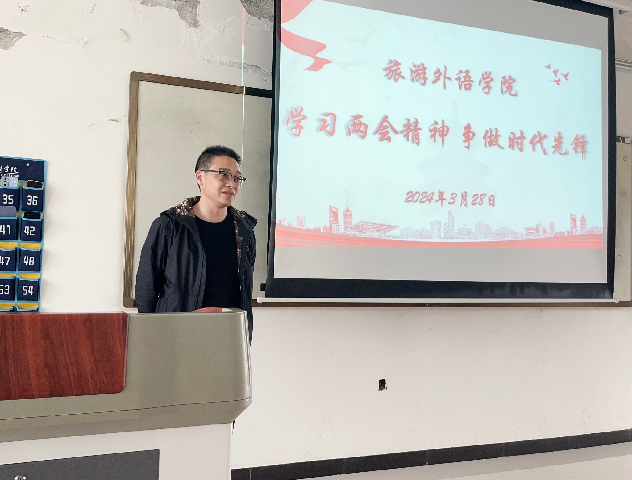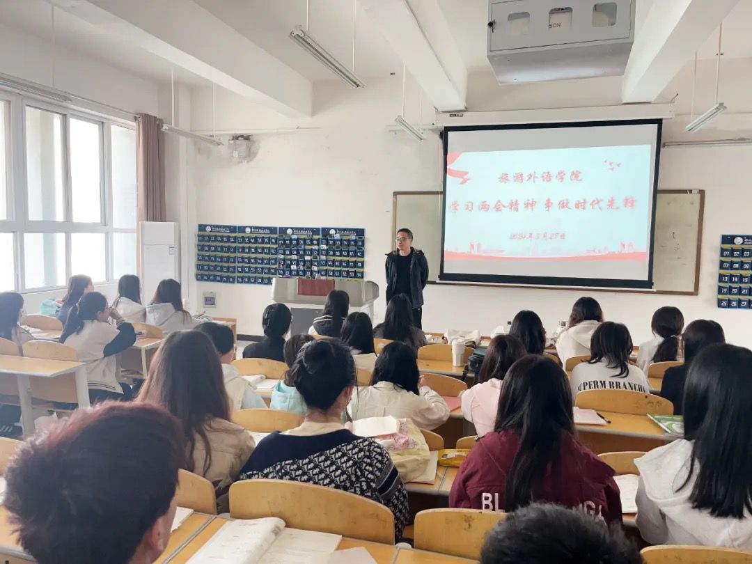 3月28日,旅游外语学院党总支书记肖磊在清源楼211教室以《学习两会精神 争做时代先锋》为题,讲授专题思政课。带领青年大学生深入学习习近平总书记在全国两会期间发表的系列重要讲话精神和全国两会精神,引领青年大学生永远跟党走、奋进新征程。