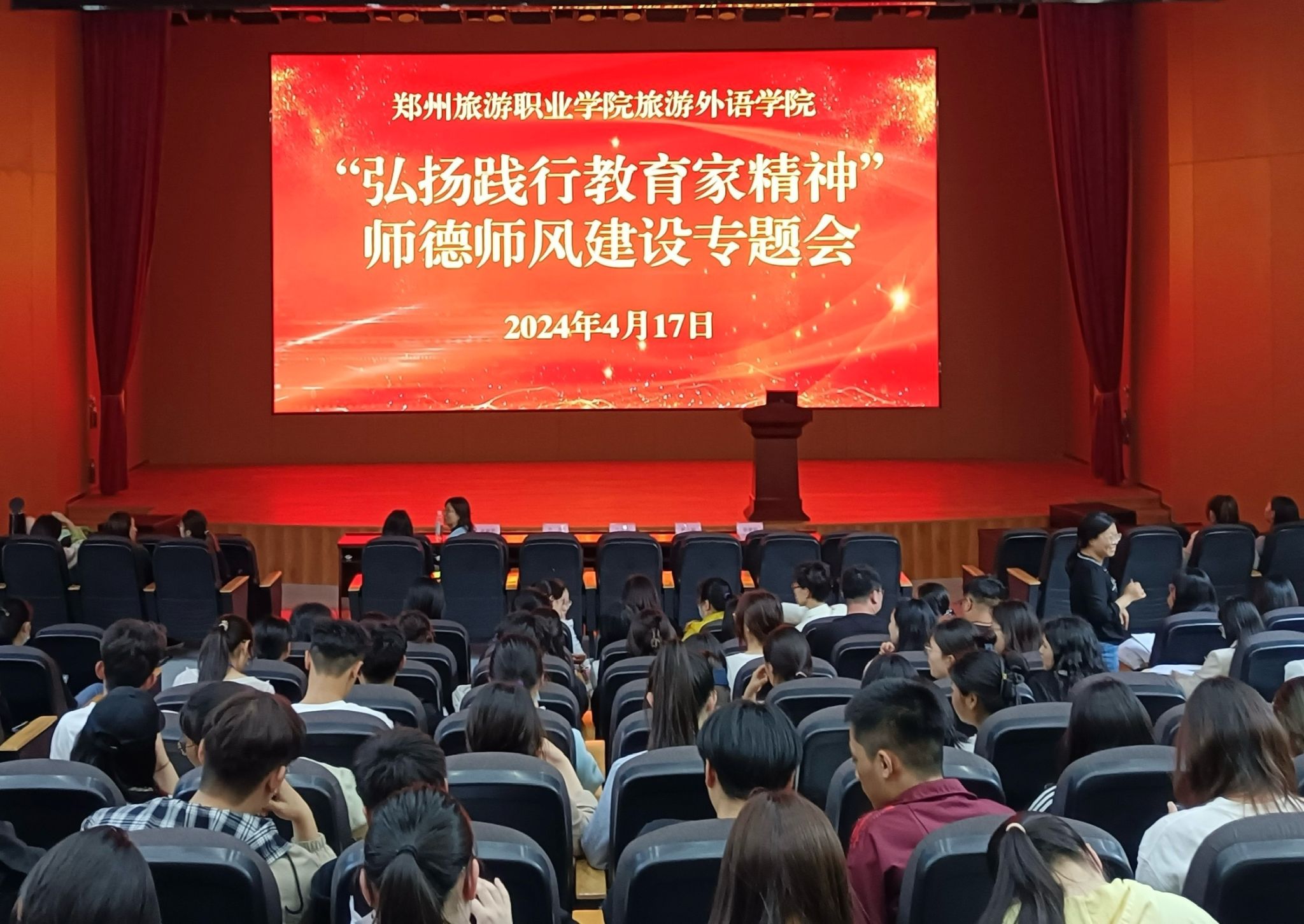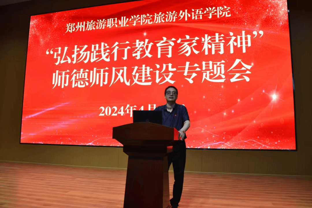 为进一步加强全体教师的师德师风教育,提高教师的思想政治素质,弘扬践行教育家精神,4月17日旅游外语学院在2号楼报告厅召开“弘扬践行教育家精神”师德师风建设专题会。旅游外语学院党总支书记肖磊、副院长张丽君出席,全体教职工参加会议。