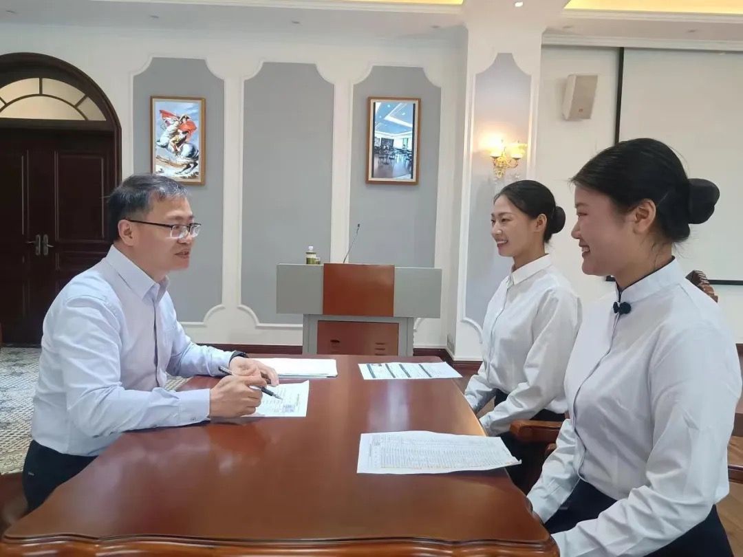 邮轮定向人才培养班学生选拔评价维度为:英语语言技能、职业意向、职业素养和技能。学生英语语言技能和职业意向由学院教师评测,学生职业素养和技能主要由企业教师评定。56名通过第一环节面试的同学参加了今天的职业素养和技能评测。来自中江国际的两位企业教师根据评价标准对学生职业素养和技能进行了评估和打分。最终将选出40名同学加入2024年邮轮定向人才培养班。