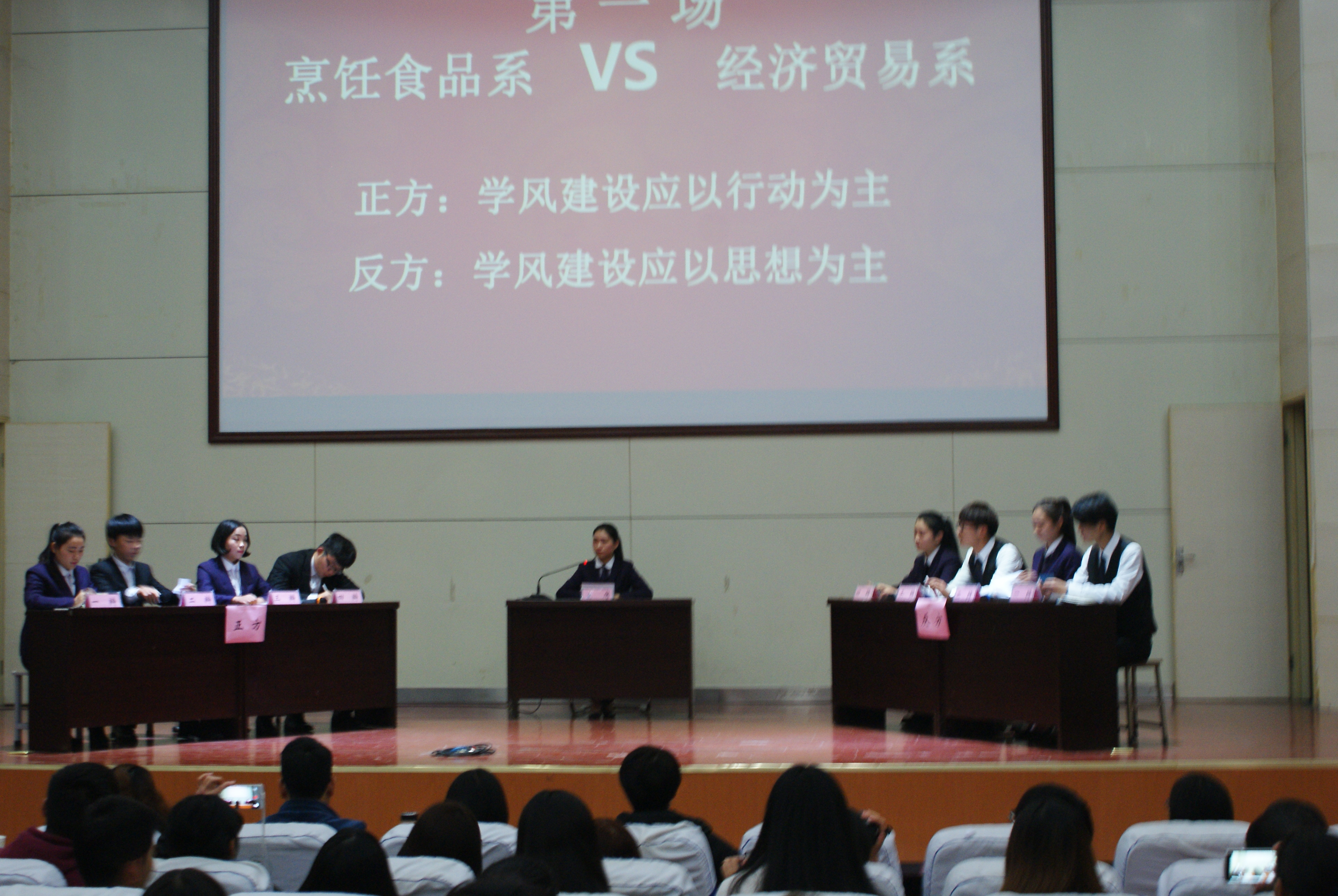 本次辩论赛分为两场,在主持人宣读完比赛规则和注意事项后比赛正式开始。第一场进行辩论的队伍为烹饪食品系和经济贸易系,围绕“学风建设应以行动为主还是思想为主”展开辩论,过程中正方从多角度、多方面论述本方观点,举出诸多事例对自己的观点进行佐证,反方辩手也积极指出正方漏洞以突出己方观点。双方的精彩表现给观众留下了深刻印象,凭借着出色的表现,正方三辩获得本场“最佳辩手”称号,最后正方烹饪食品系获得本轮胜利。第二场进行辩论的队伍为酒店管理系和旅游管理系,围绕“在校大学生积累知识更重要还是塑造人格更重要”展开辩论。辩论双方辩友你来我往,侃侃而谈,幽默的语言和缜密的思维将赛场的气氛进一步推向了高潮。最终正方一辩获得了本场“最佳辩手”称号,正方酒店管理系获得第二轮的胜利。