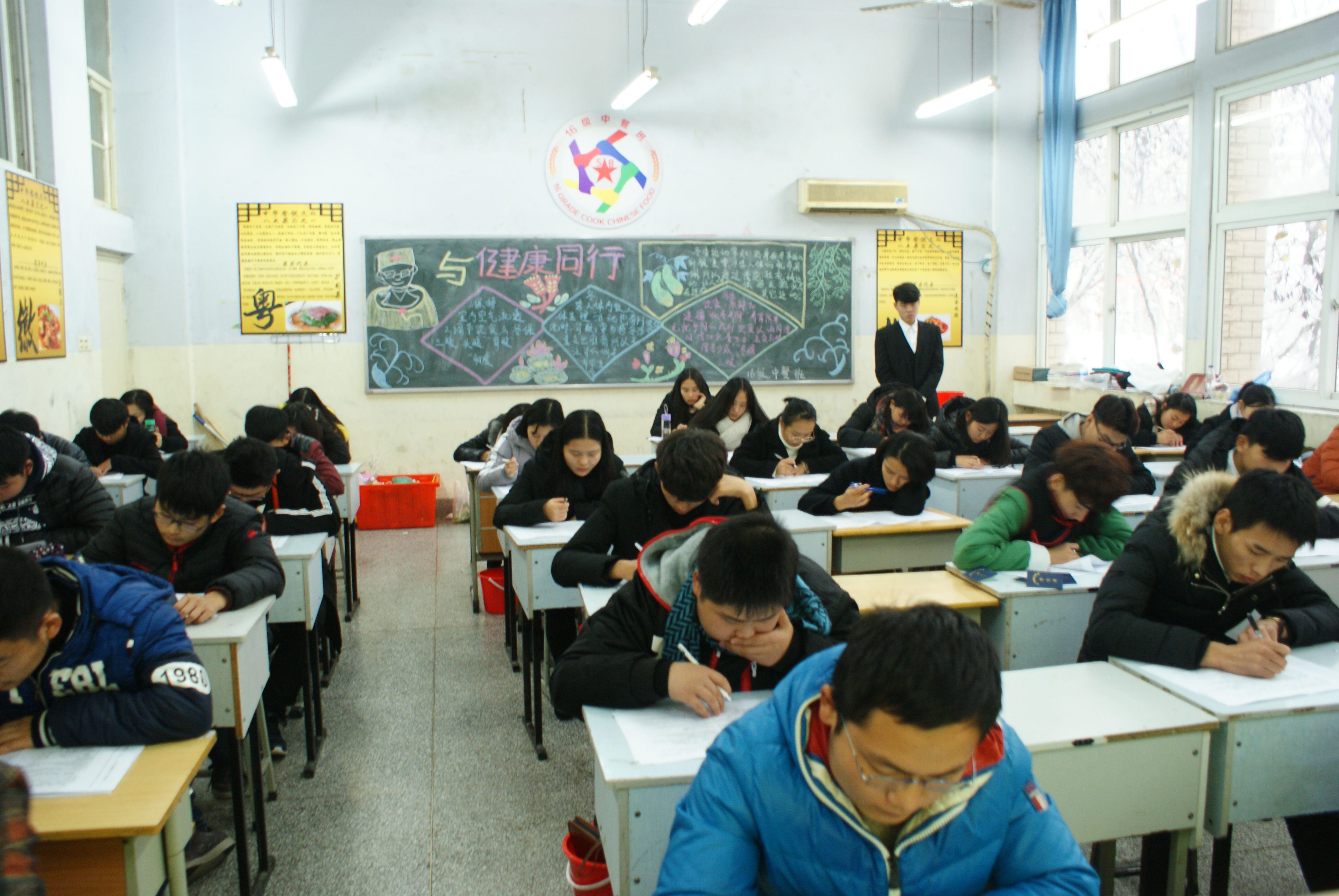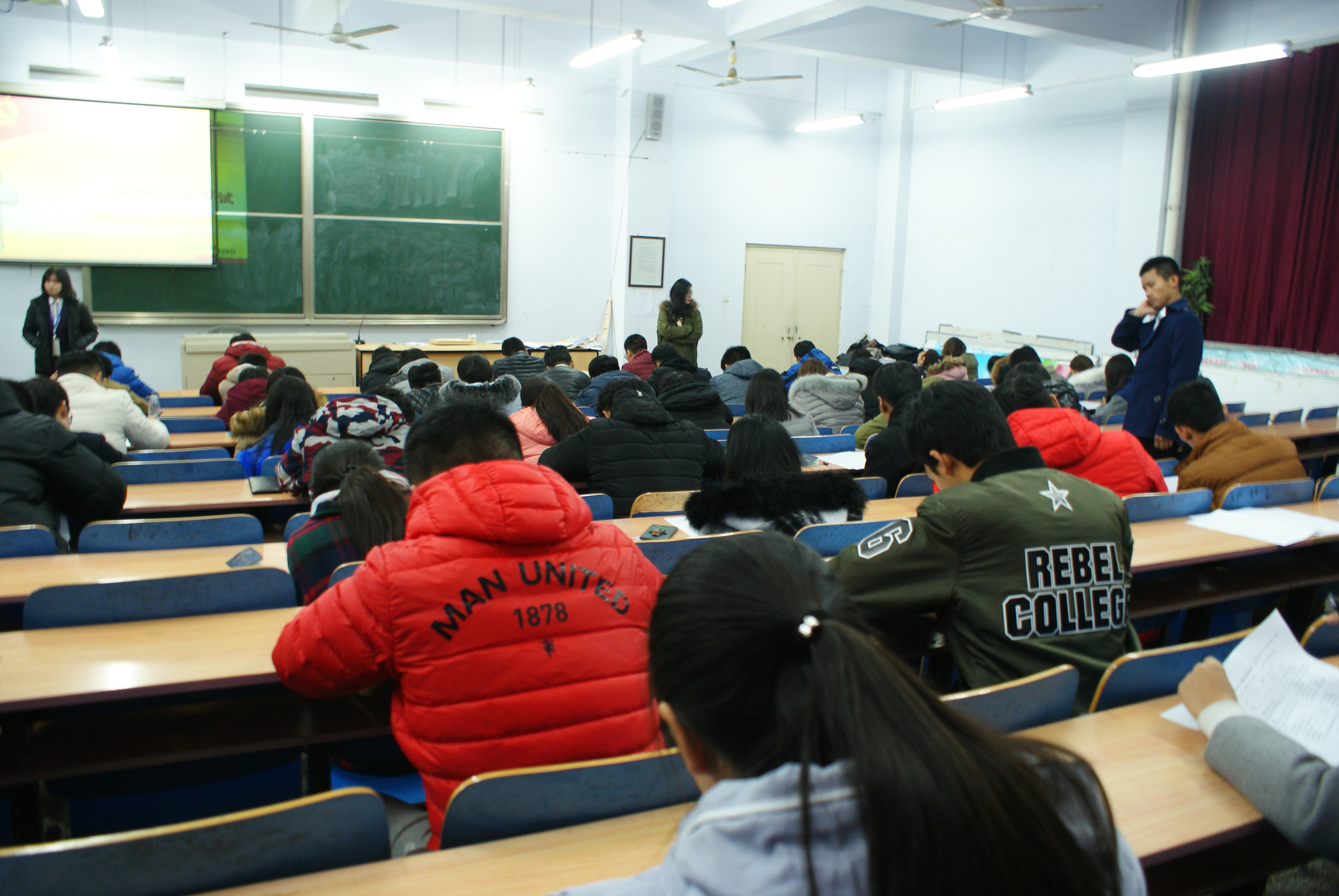 此次考试同学们都做了充分的准备,一个个都胸有成竹,迈着坚定的步伐走进了考场。考试时间为一个半小时,试卷共有六页,题型分别是填空、选择和自由发挥的拓展题。在试卷发到同学们的手里后,同学们开始奋笔疾书,一副胜券在握的样子,也不乏有一部分同学抓耳挠腮,不知该如何下笔。最后,在时间结束后,同学们的试卷被收回,等待阅卷老师的批改。