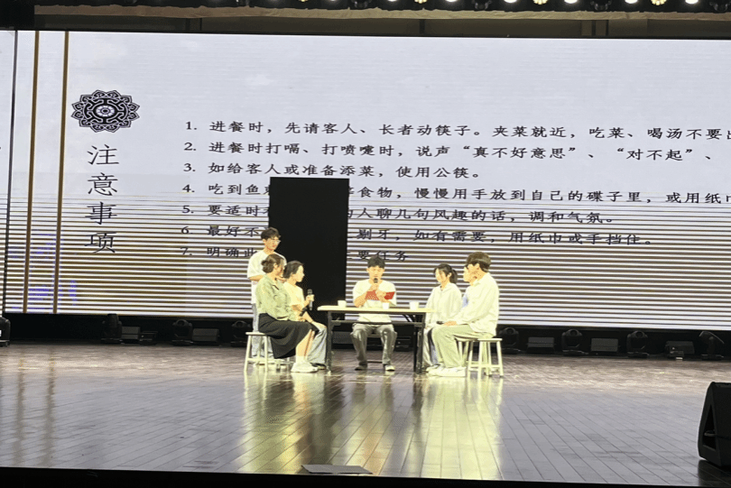 第一环节为文明礼仪风采展示《礼仪操知书达理,传承美仪》,礼仪队服装整齐,步伐划一,举止优雅,以饱满的精神状态展现出文明礼仪的风采。第二环节为文明礼仪情景剧《文雅之堂以礼相待》,我院结合中餐用餐礼仪,设计演绎情景剧,博得台下观众们的阵阵喝彩,展示了用餐基本礼仪、餐具使用方法、桌面文化等知识,向同学们普及了中国传统餐饮文化。最终,在指导老师和参赛同学的共同努力下,烹饪食品学院荣获三等奖。