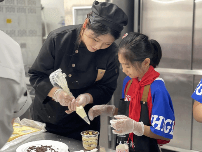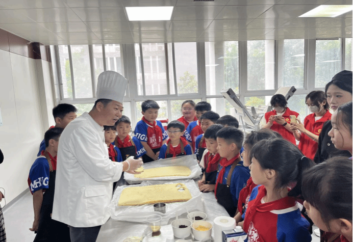 2024年5月29日下午,在学生处指导下,教研室主任韩小院、王风雷进行协调沟通,西点专业课教师张玉东、中西面点专业课教师孔方媛,辅导员张莉莉和史思念组织带领鸿雁小学50名学生在教室、实训室等地开展“劳动润心”育人工程“中国梦 劳动美”劳动特色实践活动,制作巧克力芒果蛋糕,增强学生劳动实践意识和合作精神。