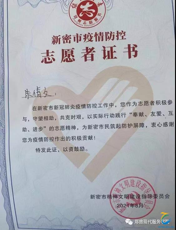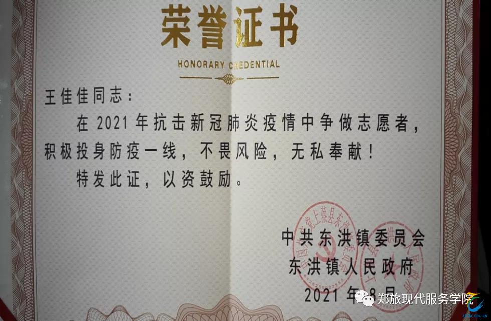 现代服务学院21级空中乘务四班郑佳慧参加了抢险救灾志愿工作和防疫志愿工作,从第一次核酸检测到第五次核酸检测,她从未缺席、不畏艰险、勇于奉献。