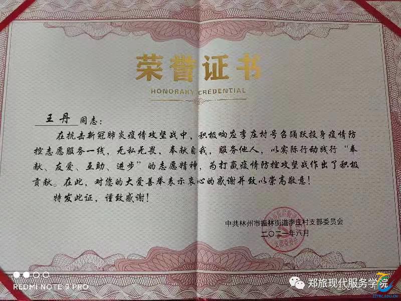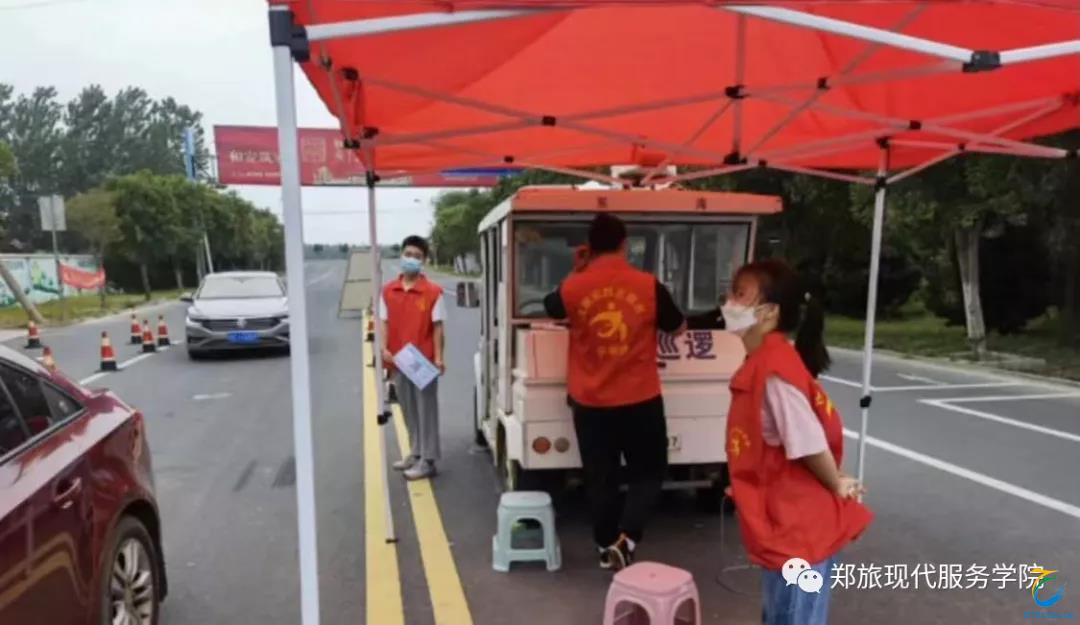 现代服务学院21级空中乘务四班王晴晴参加了当地疫情防控志愿工作。主要负责登记来访人员信息,对当地居民进行测温,对进出车辆进行消毒。她能够主动请缨,不畏艰难加入到疫情防控的队伍中,展现了她的责任与担当,她说:“虽责任沉重,但我一定会继续努力,当好邻居心中的‘小门神’。”