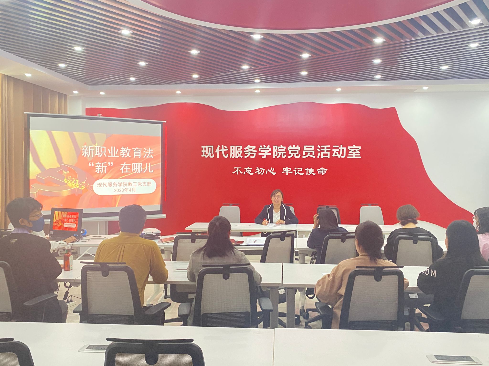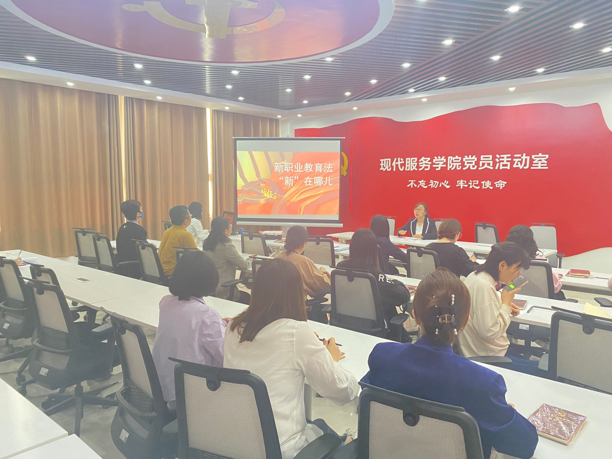 为适应职业教育发展面临的新形势、新要求,系统全面地了解新修订的《中华人民共和国职业教育法》的关键变革。现代服务学院教工党支部在4月19日下午召开“深入学习《中华人民共和国职业教育法》”主题党日活动,由教工党支部书记张莹讲课,支部全体党员参与学习。
