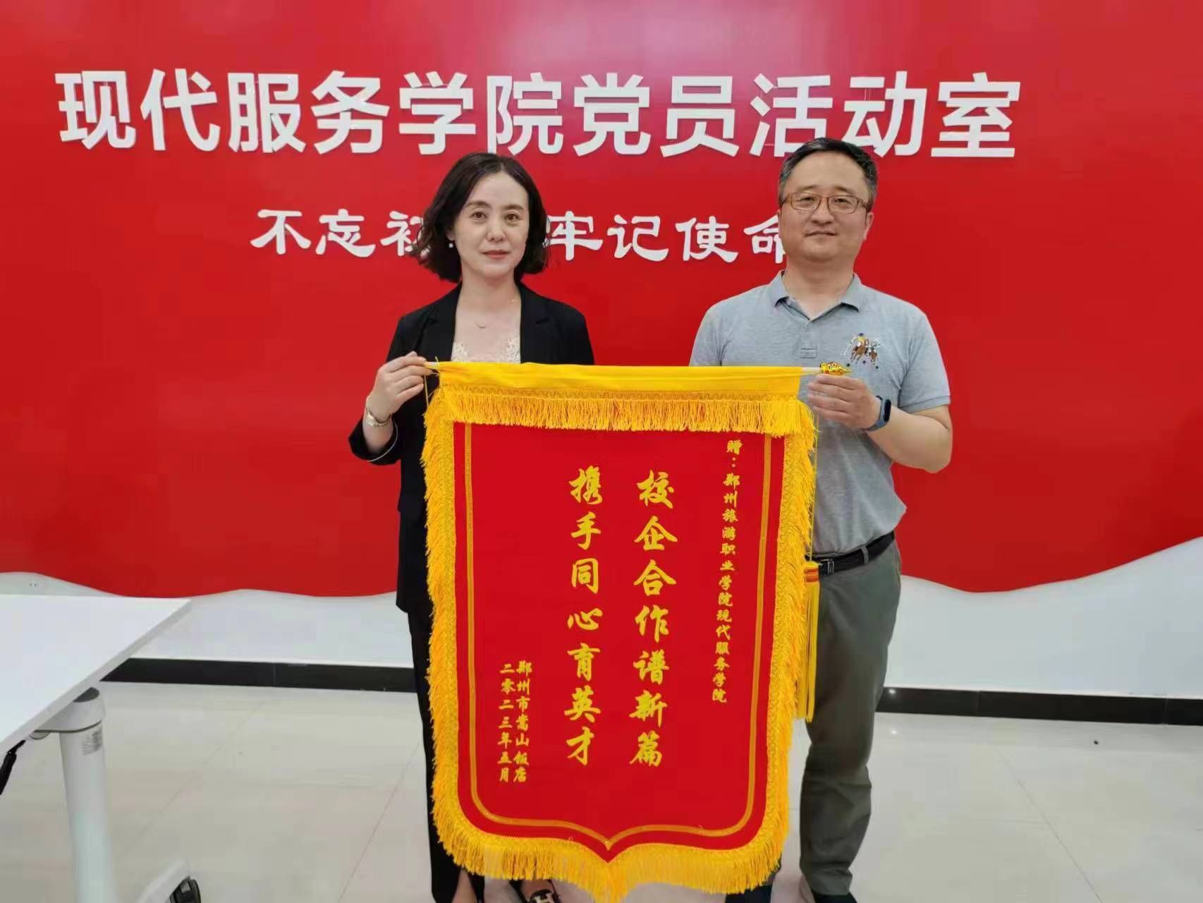 5月17日下午,校企合作单位郑州市嵩山饭店人力资源部经理李黎老师专程为我院送上锦旗一副:“校企合作谱新篇携手同心育英才”,感谢学院为企业输送了大批高质量人才以及在实习和就业工作方面的精心组织和安排,并就校企双方下一步合作进行交流。