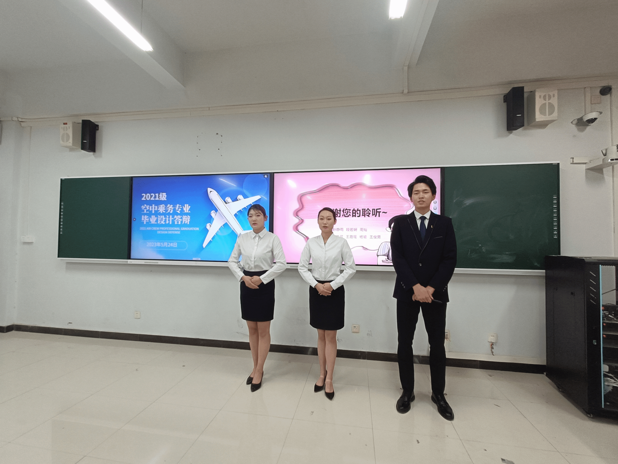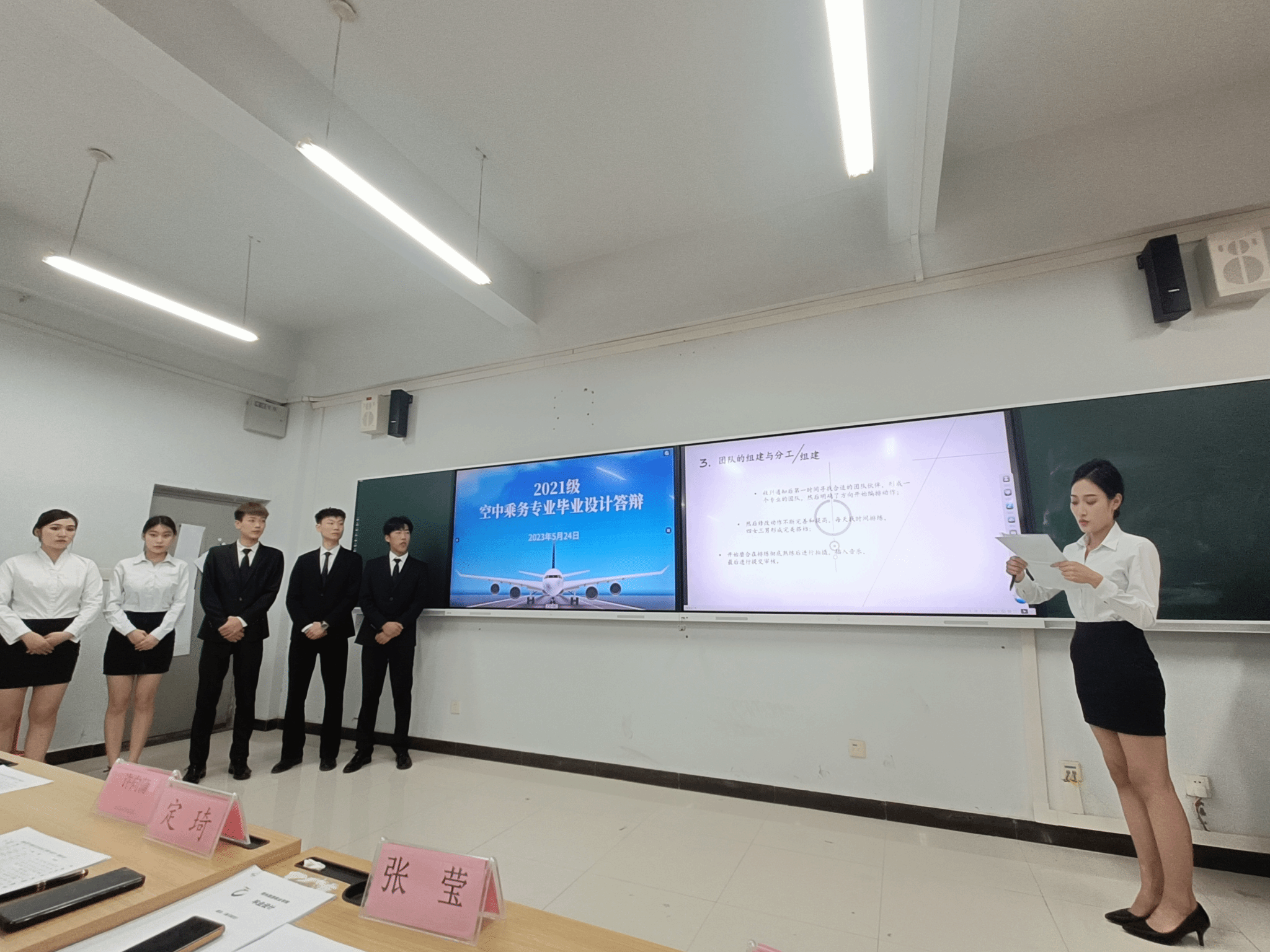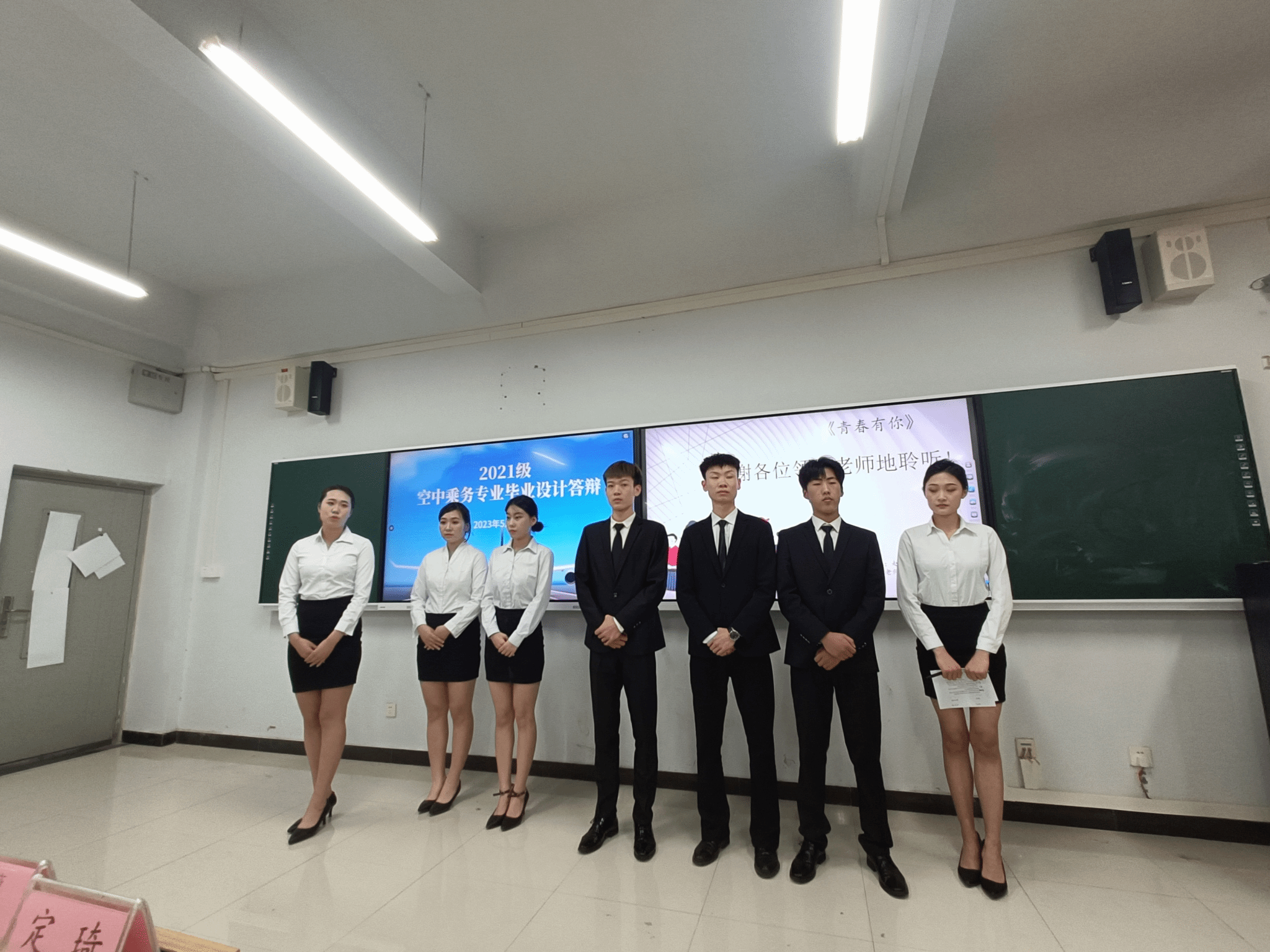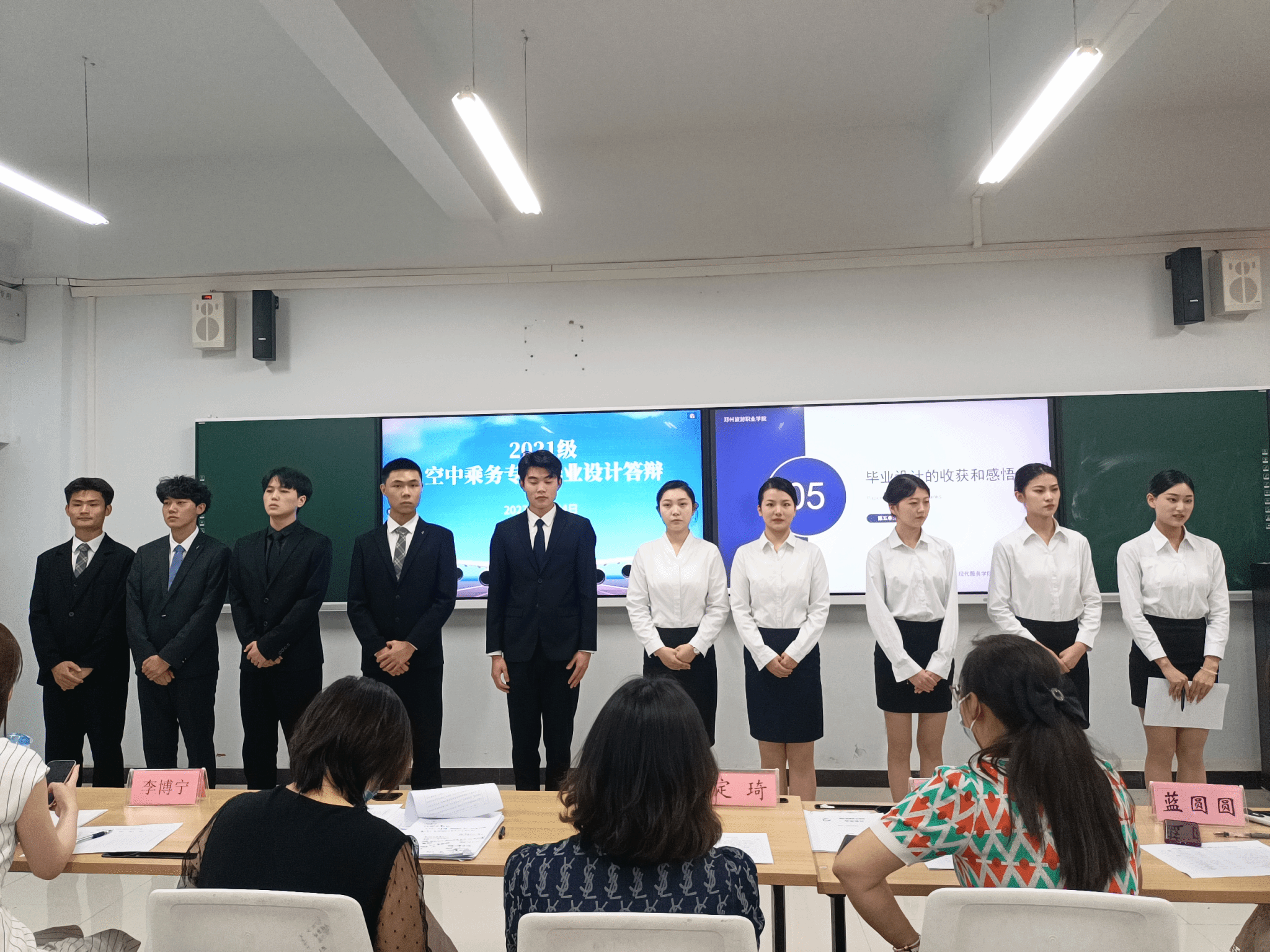2023.5.24现代服务学院举行了2021级空中乘务专业毕业设计答辩,现代服务学院院长徐向蒲、党总支书记郭防、副院长定琦、教研室主任张莹,以及空中乘务专业教师邵小明、蓝圆圆、贺河、李博宁参加了现场答辩。