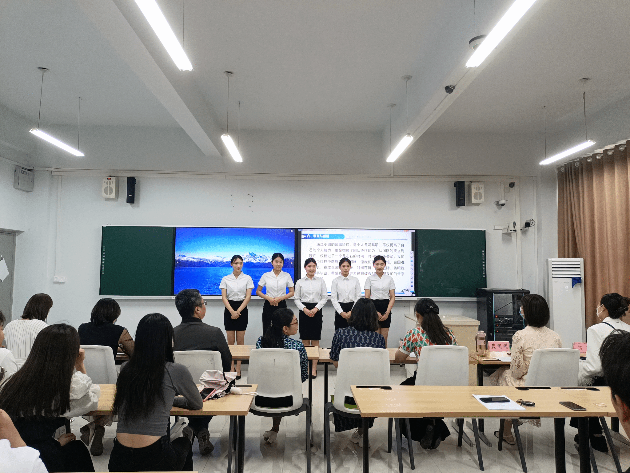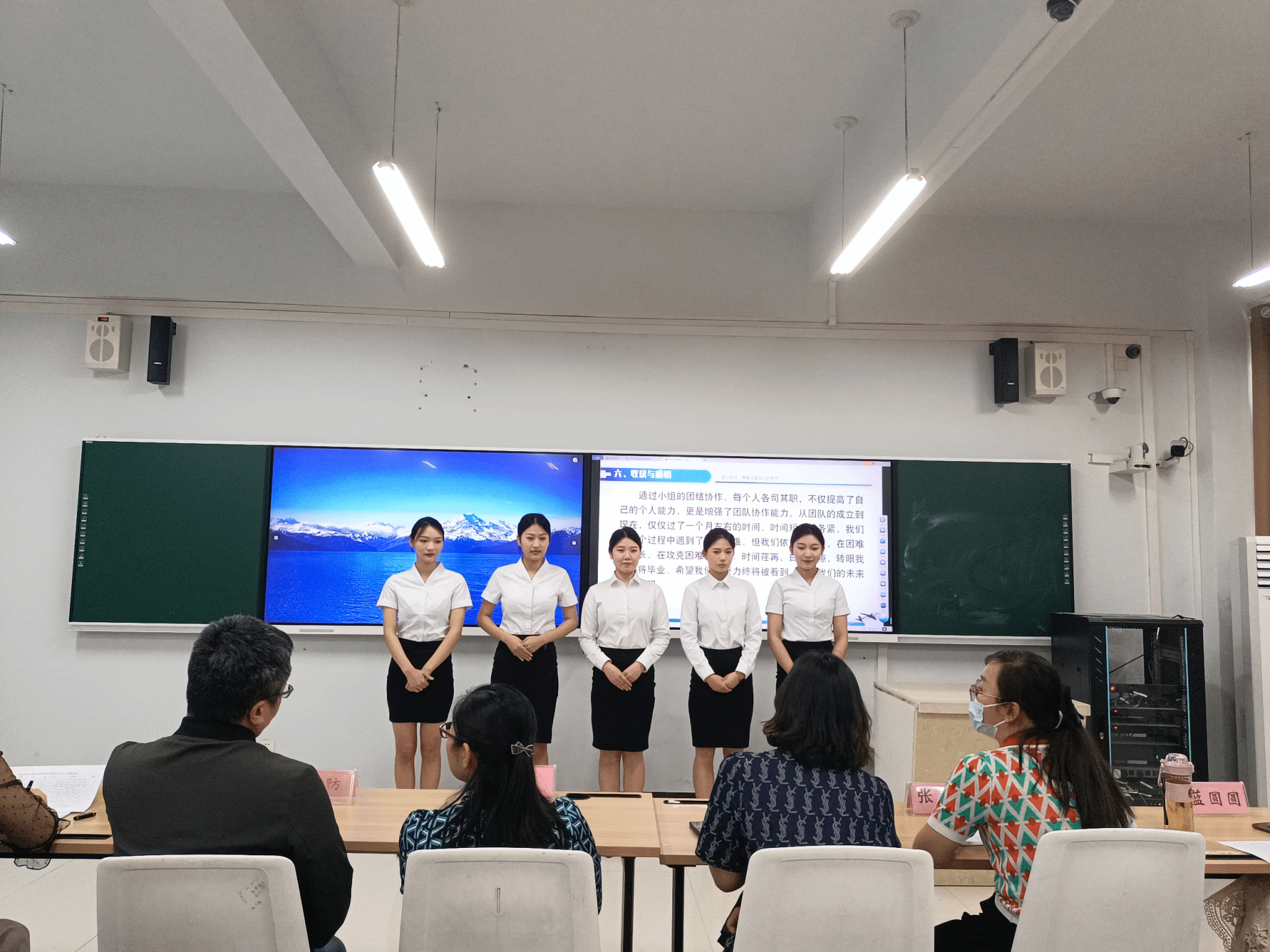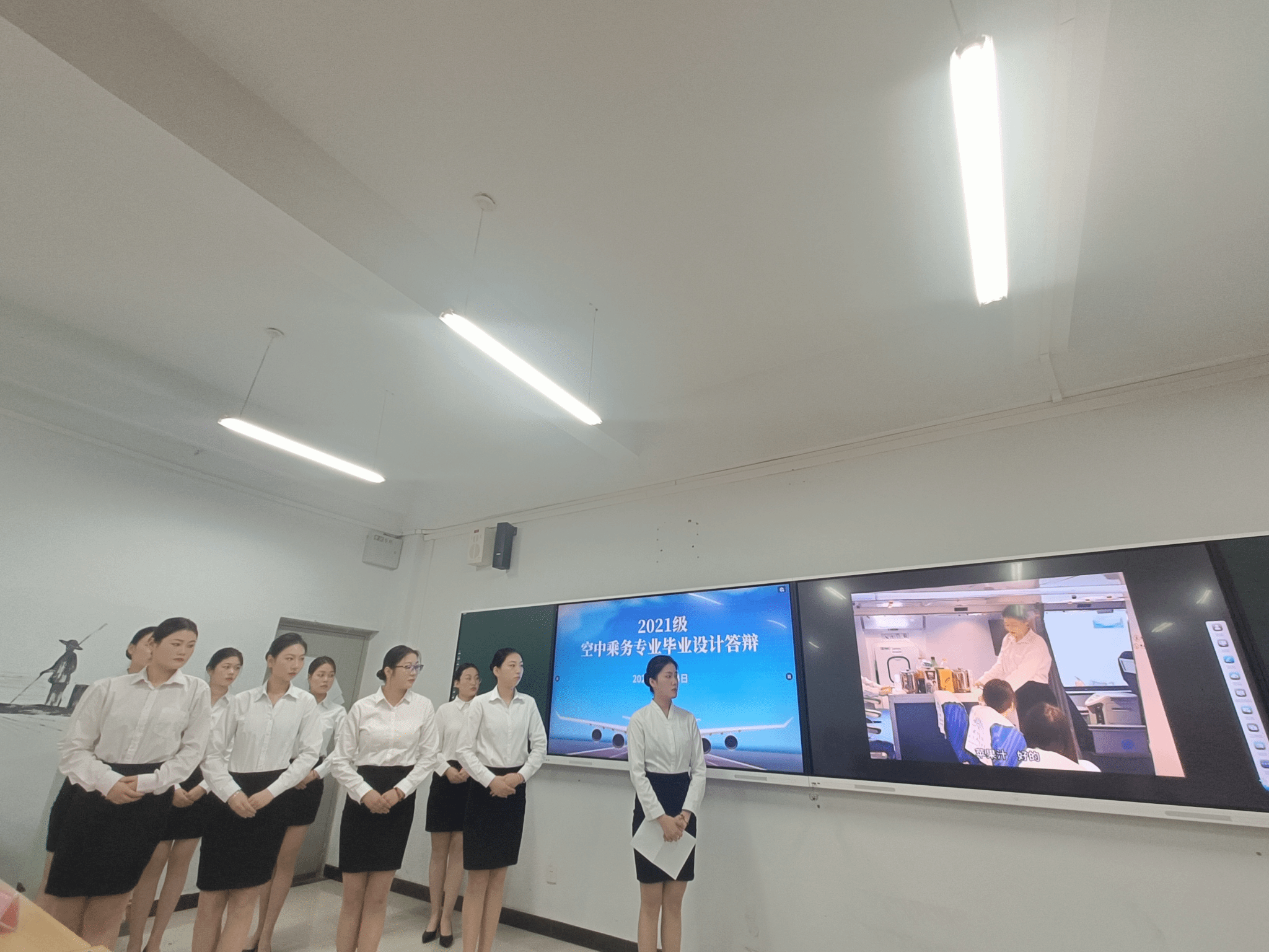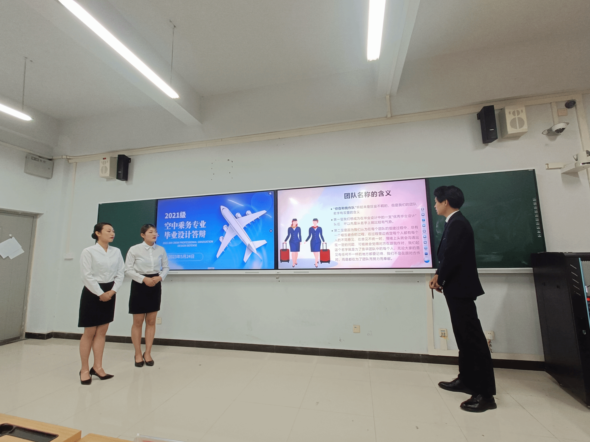 2023.5.24现代服务学院举行了2021级空中乘务专业毕业设计答辩,现代服务学院院长徐向蒲、党总支书记郭防、副院长定琦、教研室主任张莹,以及空中乘务专业教师邵小明、蓝圆圆、贺河、李博宁参加了现场答辩。
