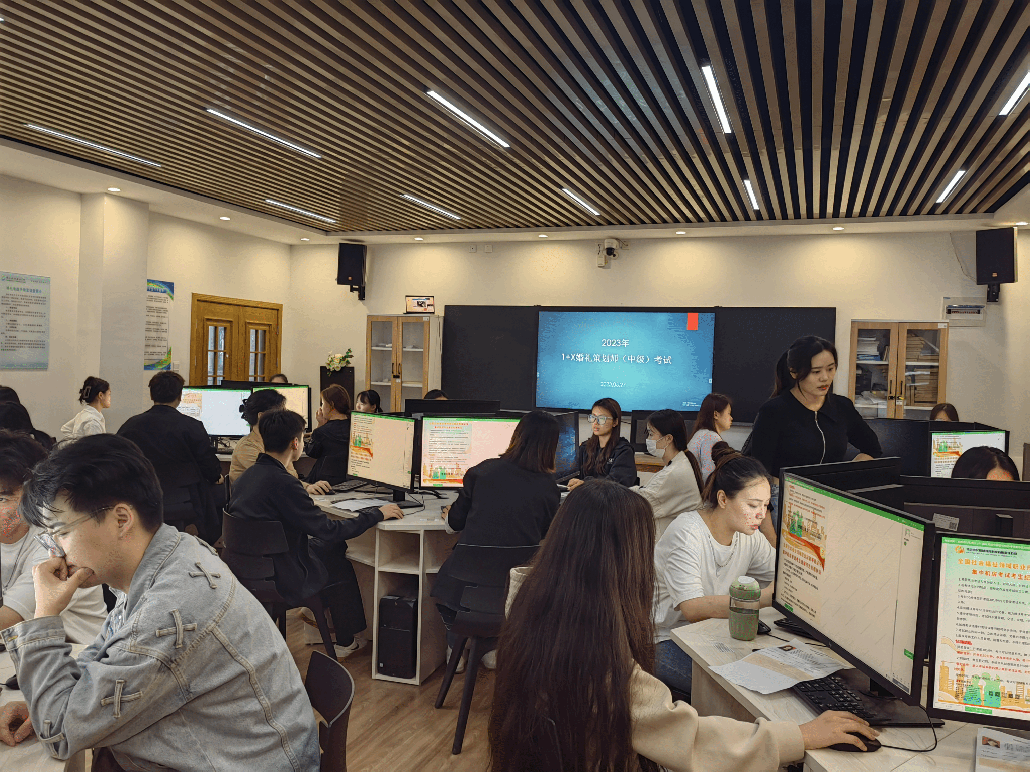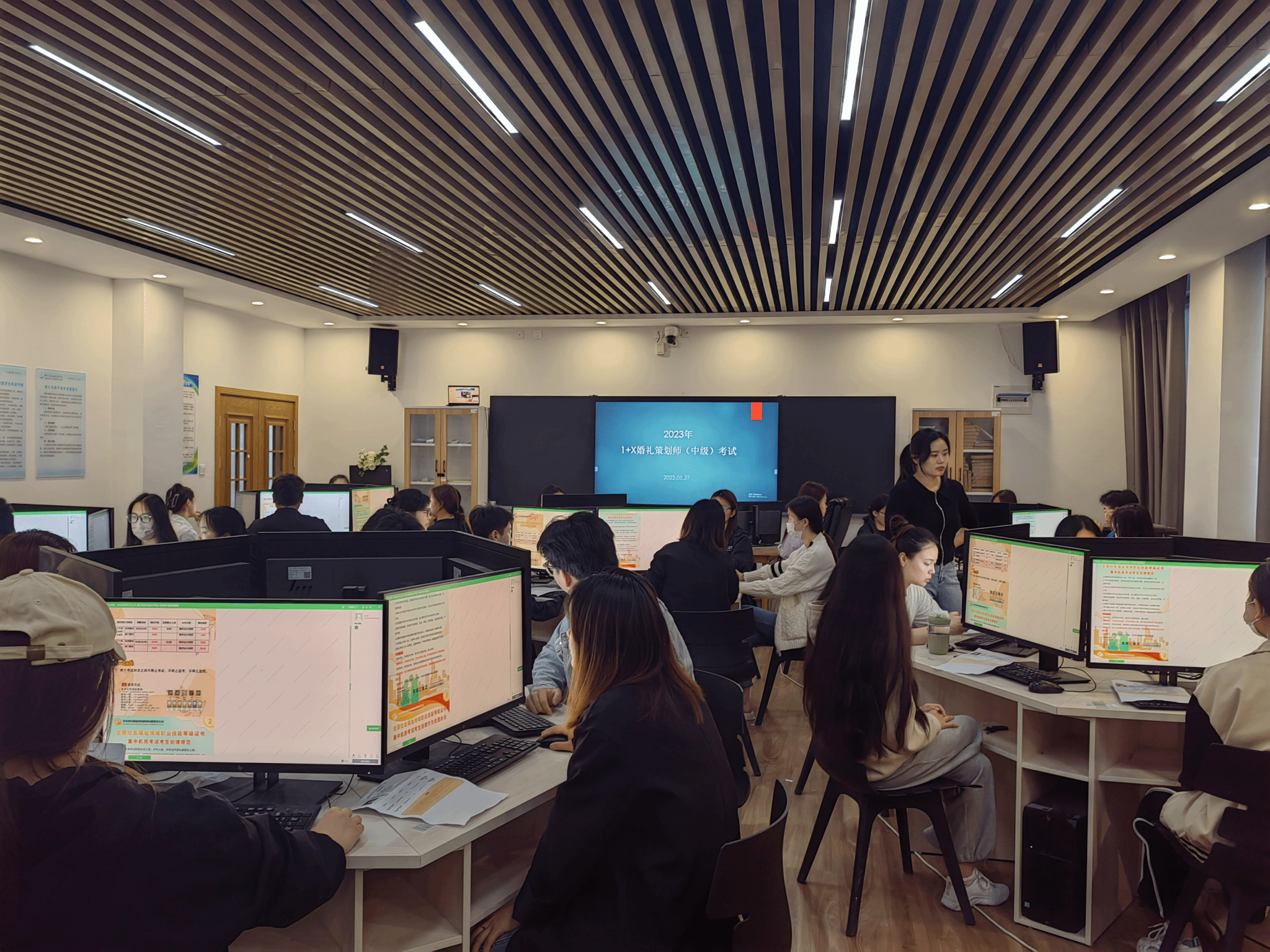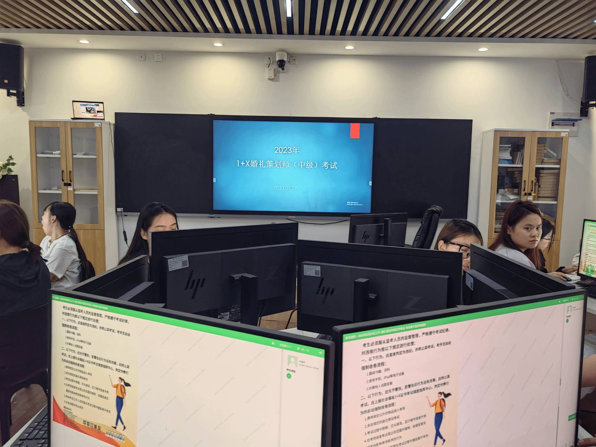此次中级婚礼策划 “1+X”技能证书考评包括婚礼实务、婚礼实践两个考核项目,均为上机考试。此次共设置35台标准化考试机器,考核对象为我院21级婚庆服务与管理专业30名学生,每名考生在90分钟内完成每个项目的考试内容。考评工作严谨细致、流程规范。