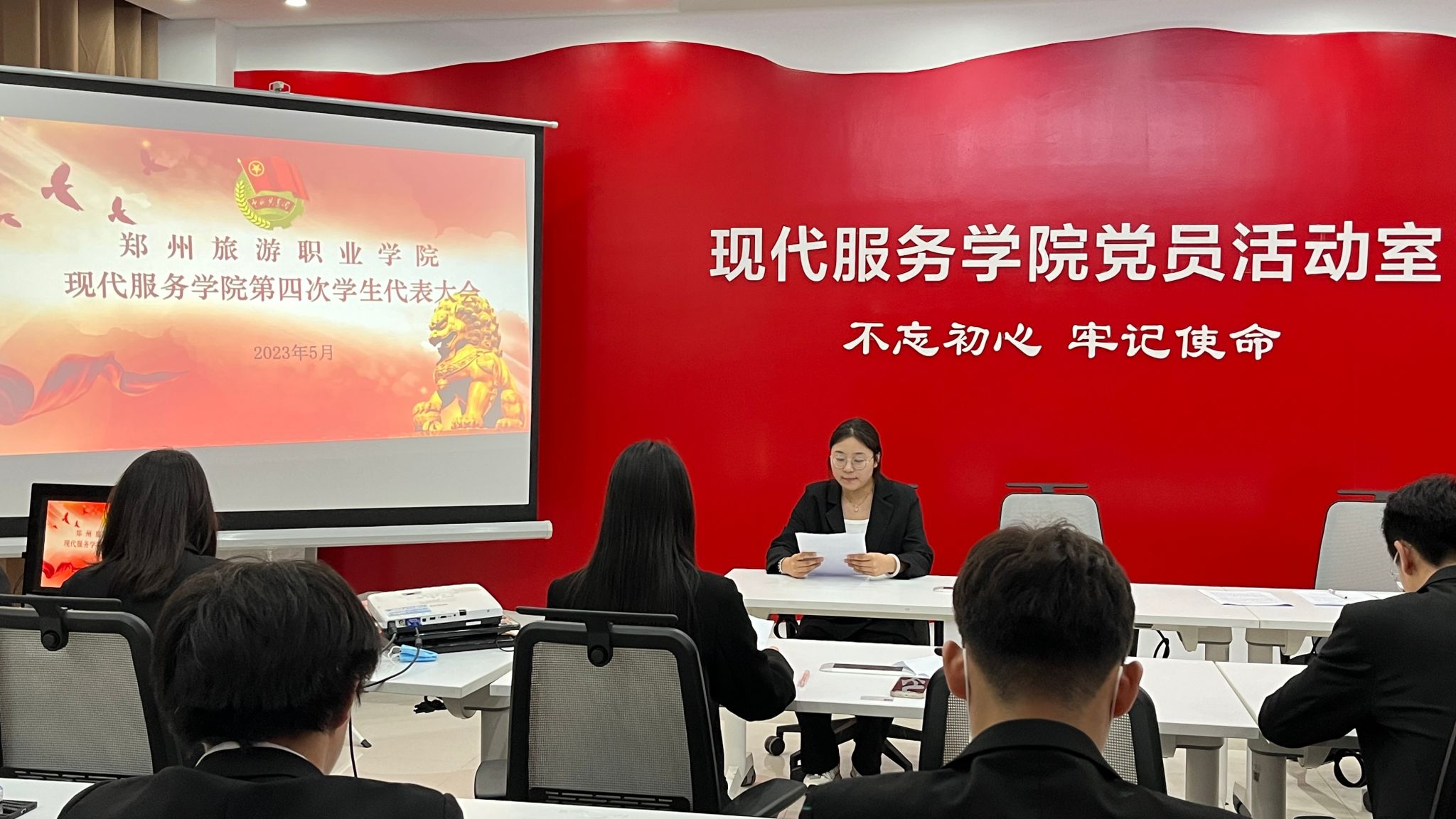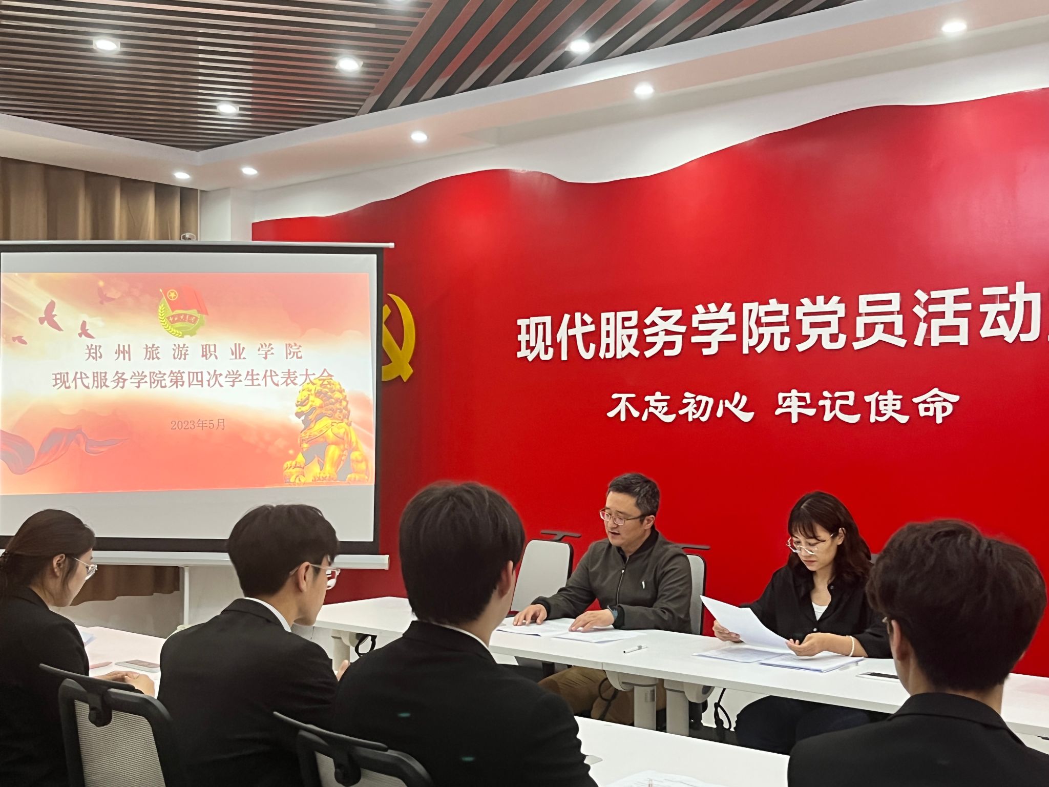 为进一步加强学院学生干部队伍建设,扩充学生会后备力量,现代服务学院于2023年5月29日下午1A208会议室召开了第四次学生代表大会。现代服务学院党总支书记郭防出席会议、现代服务学院学生会主席贾冰冰及19位学生代表参加本次会议,会议由现代服务学院学生党支部书记段会利主持。