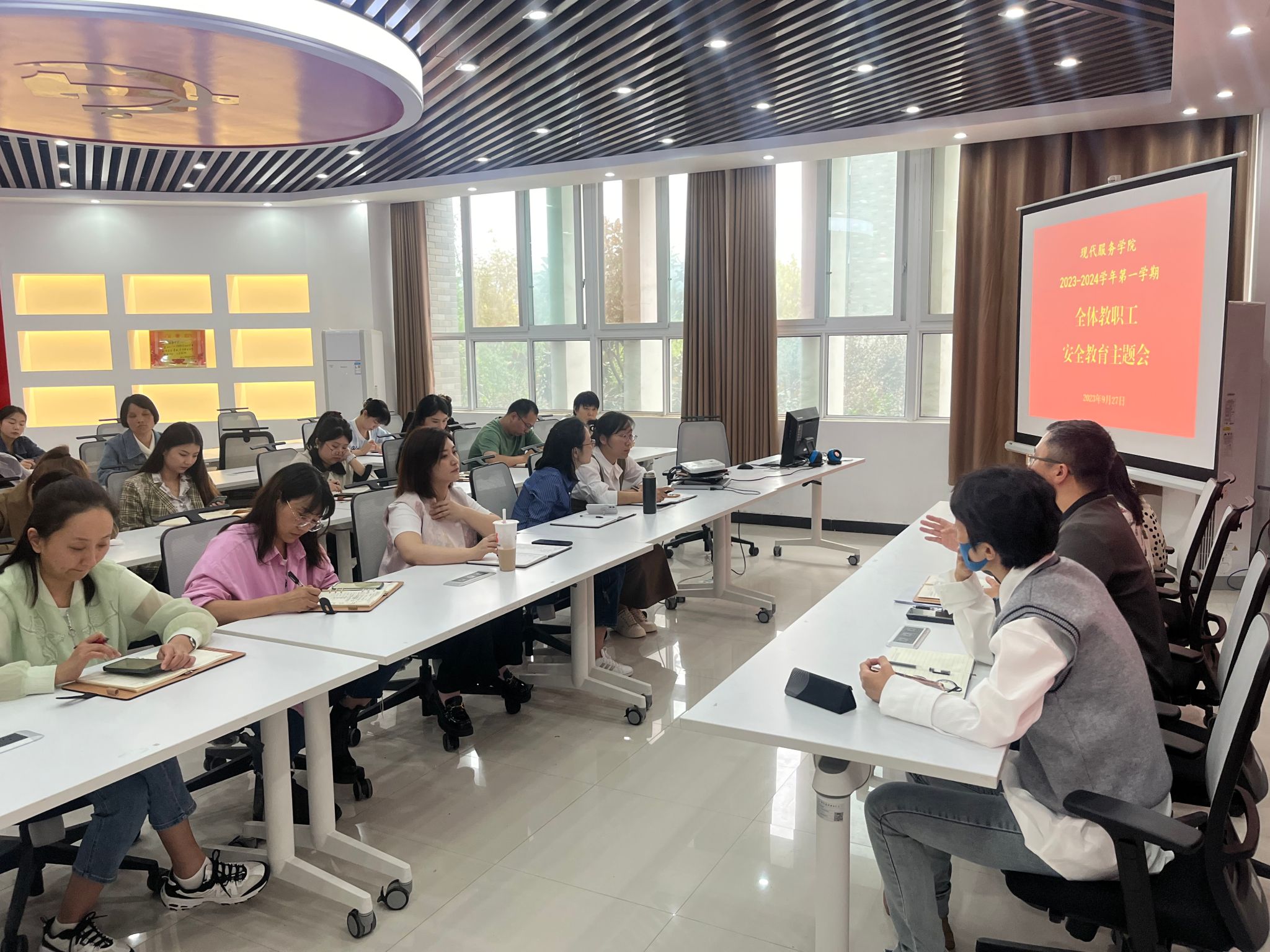 2023年9月27日下午,现代服务学院全体教职工在1A208会议室召开“安全教育”主题会议。现代服务学院党总支书记郭防、院长许向蒲、副书记岳正阳、副院长定琦出席会议,会议由许向蒲主持,全体教职工参加。