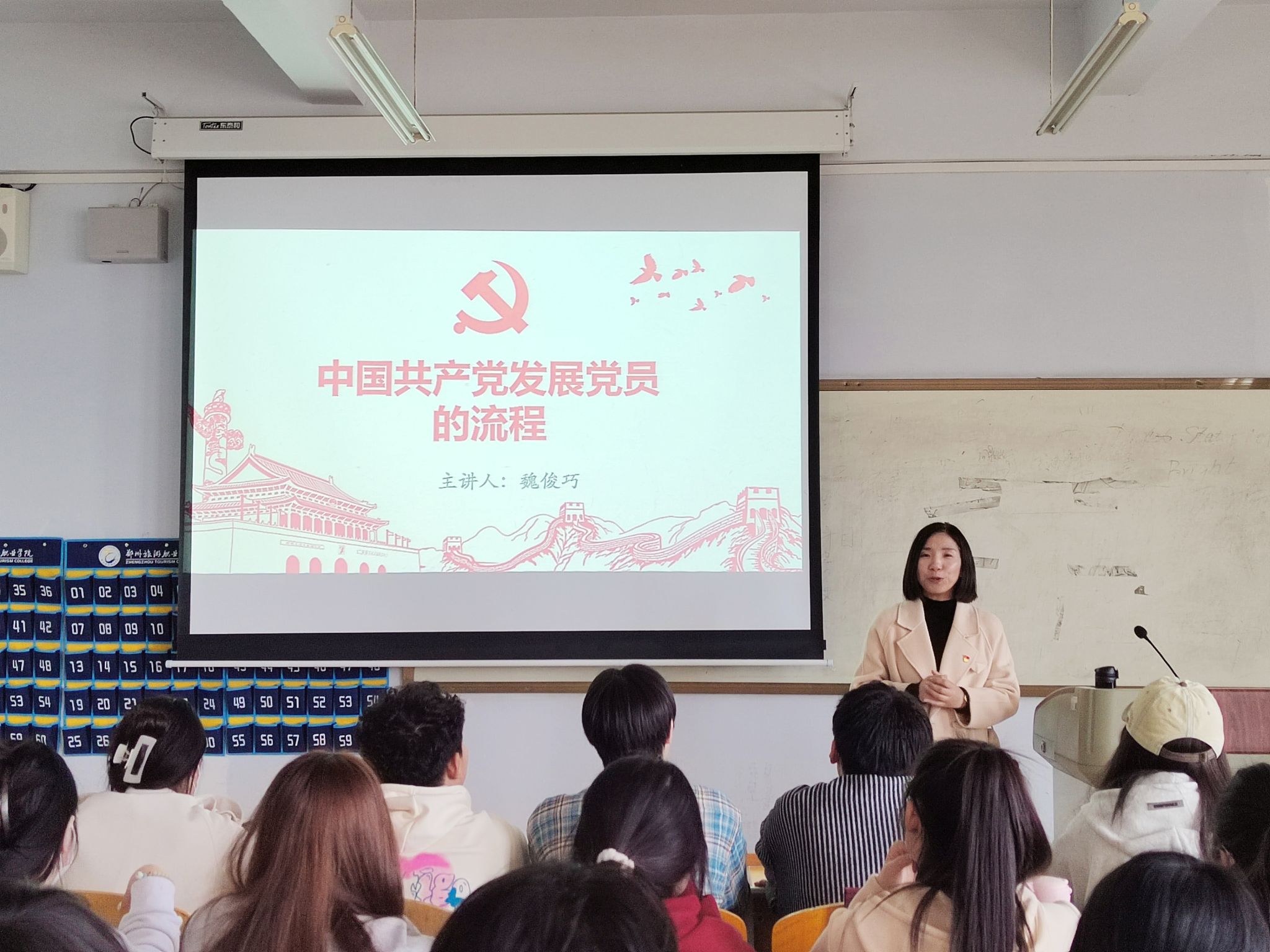3月27日下午,现代服务学院教工支部组织委员魏俊巧在1A505教室为我院入党积极分子上了一堂主题为《中国共产党发展党员的工作流程》的精彩党课。