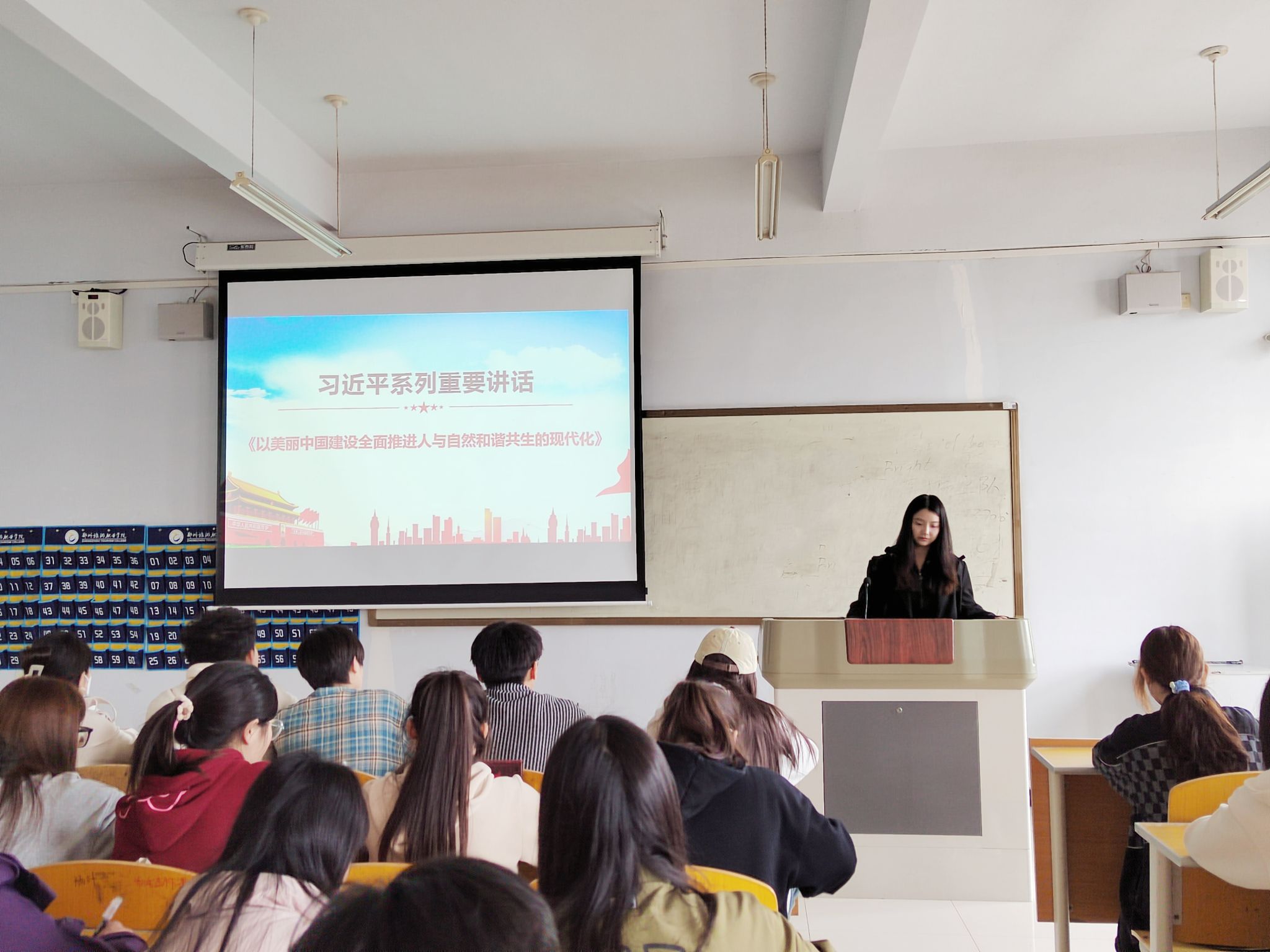 3月27日,现代服务学院教工党支部宣传委员张钰在教学楼1A505教室为入党积极分子上了一堂主题为《以美丽中国建设全面推进人与自然和谐共生的现代化》的党课。