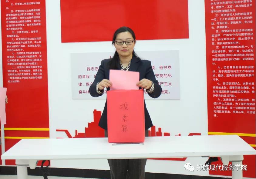 大会在庄严的《国歌》声中拉开了序幕。现代服务学院党总支书记郭防首先代表现代服务学院党总支部委员会向大会做了工作汇报,全面总结了三年来党总支在政治建设、思想建设、组织建设、作风建设、获得奖项等方面的情况。许向蒲介绍了新一届现代服务学院党总支部委员会候选人推荐情况。随后,大会审议通过了选举办法和监票人、计票人名单,并逐一介绍了党总支部委员候选人基本情况。在监票人魏俊巧同志的监督下,按照工作程序,与会党员以无记名投票方式差额选举产生了新一届现代服务学院党总支部委员会,于婕、许向蒲、岳正阳、武瑾、郭防(以姓氏笔画为序)五位同志当选新一届现代服务学院党总支部委员会委员。