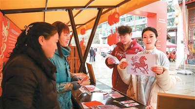 游客在老街上体验非遗剪纸。 李若妍摄 |
