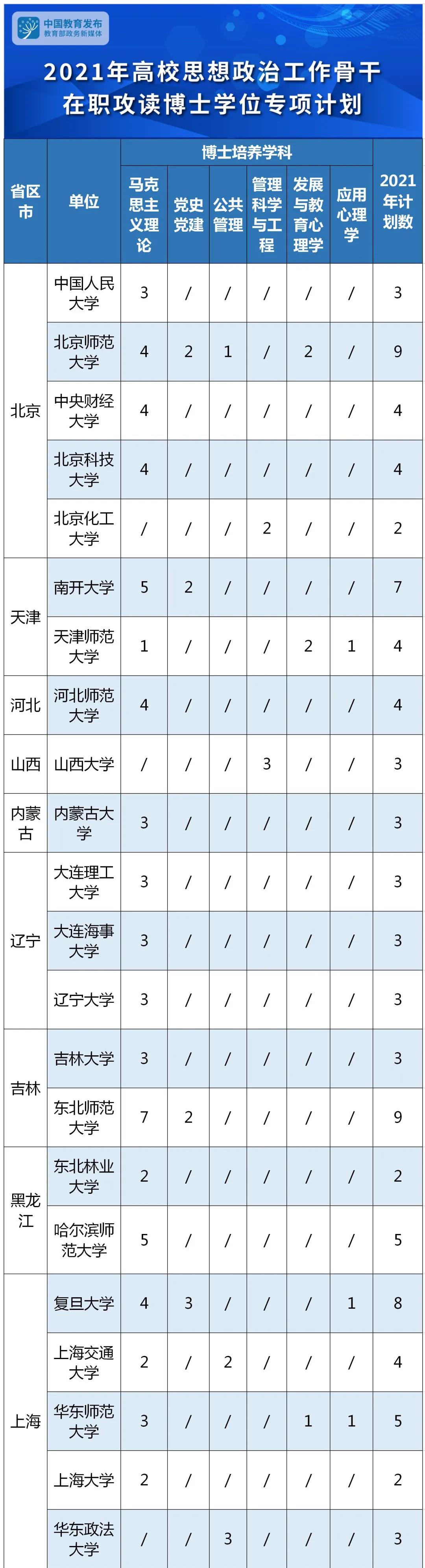 高校思想政治工作骨干在职攻读博士学位专项计划为定向培养招生计划,含在教育部、国家发展改革委下达的2021年博士生招生总规模和国家计划之内。专项计划包括马克思主义理论、党史党建、心理学、管理学等相关专业,招生名额不得挪作他用。