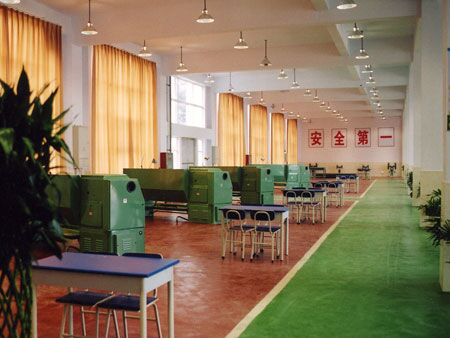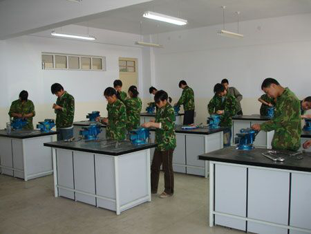 实训室主要设备有:砂轮机、台式钻床、钳工操作台及台虎钳。钳工实习间总面积有二百平方米。