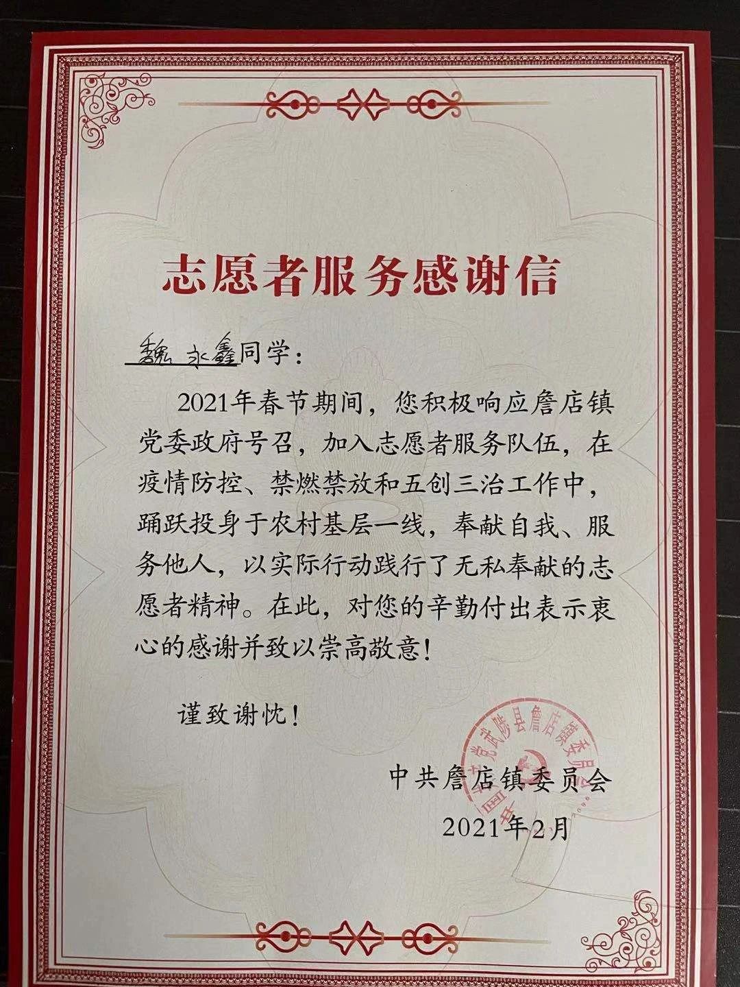 2021年春节期间,您积极响应詹店镇党委政府号召,加入志愿者服务队伍,在疫情防控、禁燃禁放和五创三治工作中,踊跃投身于农村基层一线,奉献自我、服务他人,以实际行动践行了无私奉献的志愿者精神。在此,对您的辛勤付出表示衷心的感谢并致以崇高敬意!