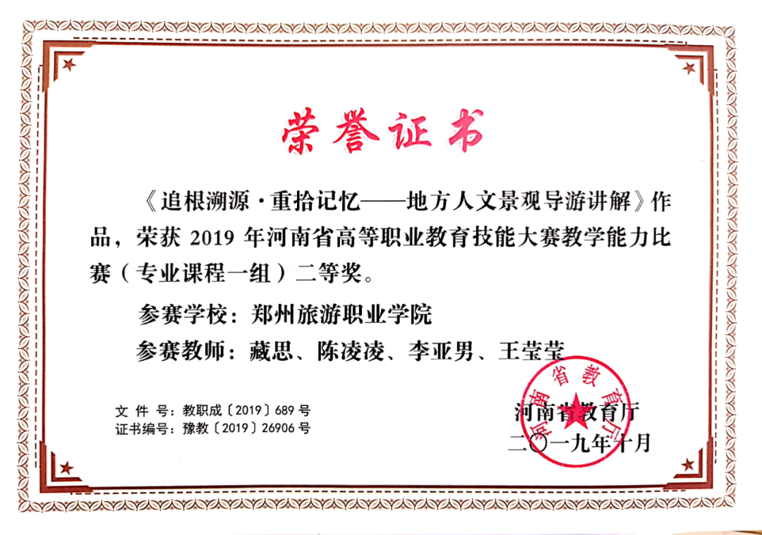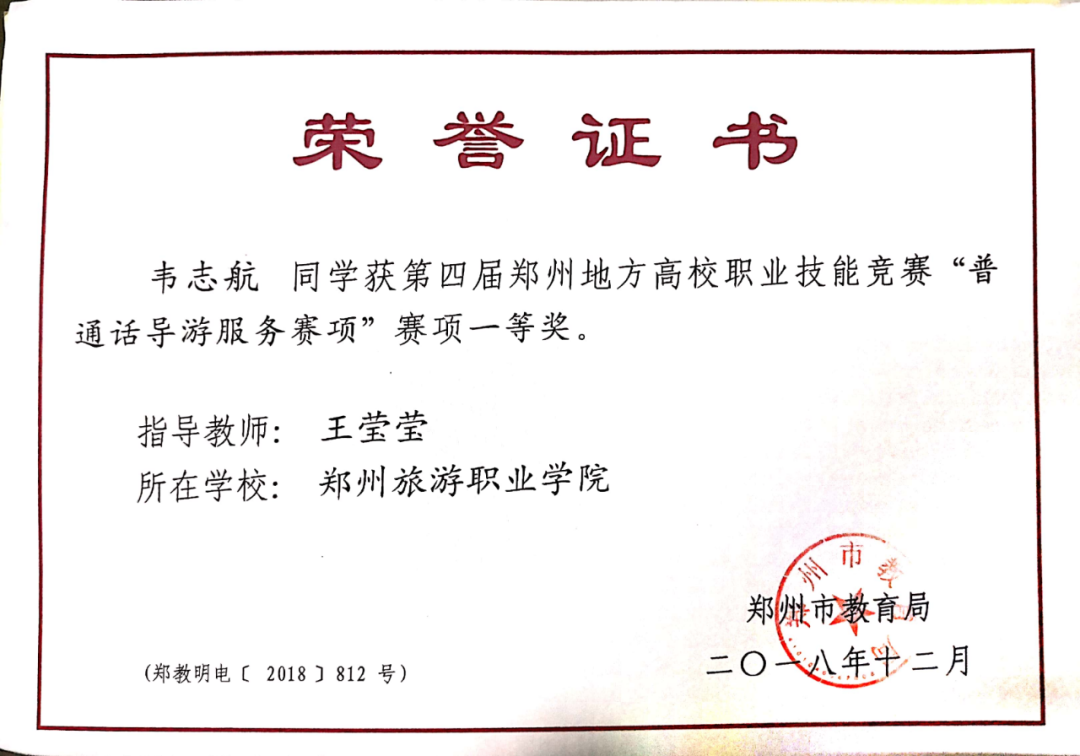 赵沙沙,先后获得郑州市中等职业学校专业技能大赛一等奖,郑州市十佳导游员等荣誉称号。