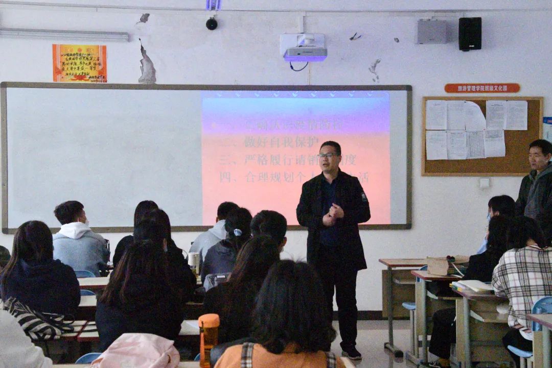 3月29日中午12:30,旅游管理学院党总支书记秦合岗在5号教学楼为2020级学生讲授思政课,他以“新时代青年的责任与担当”为题作报告,学院2020级学生代表参与课程。