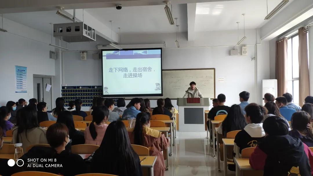 为全面贯彻落实党的思想,增强大学生体质促进学生全身心发展,机电工程学院于2021年4月6日在一号教学楼开展“走下网络,走出宿舍,走向操场”主题班会。此次班会由各班团支书主持开展。班会在轻松的氛围中有条不紊地开展,团支书以一段青春向上的开场白拉开了本次班会的序幕。然而当代大学生体质呈下降趋势,大部分时间都是宅在宿舍,缺乏锻炼,身体
