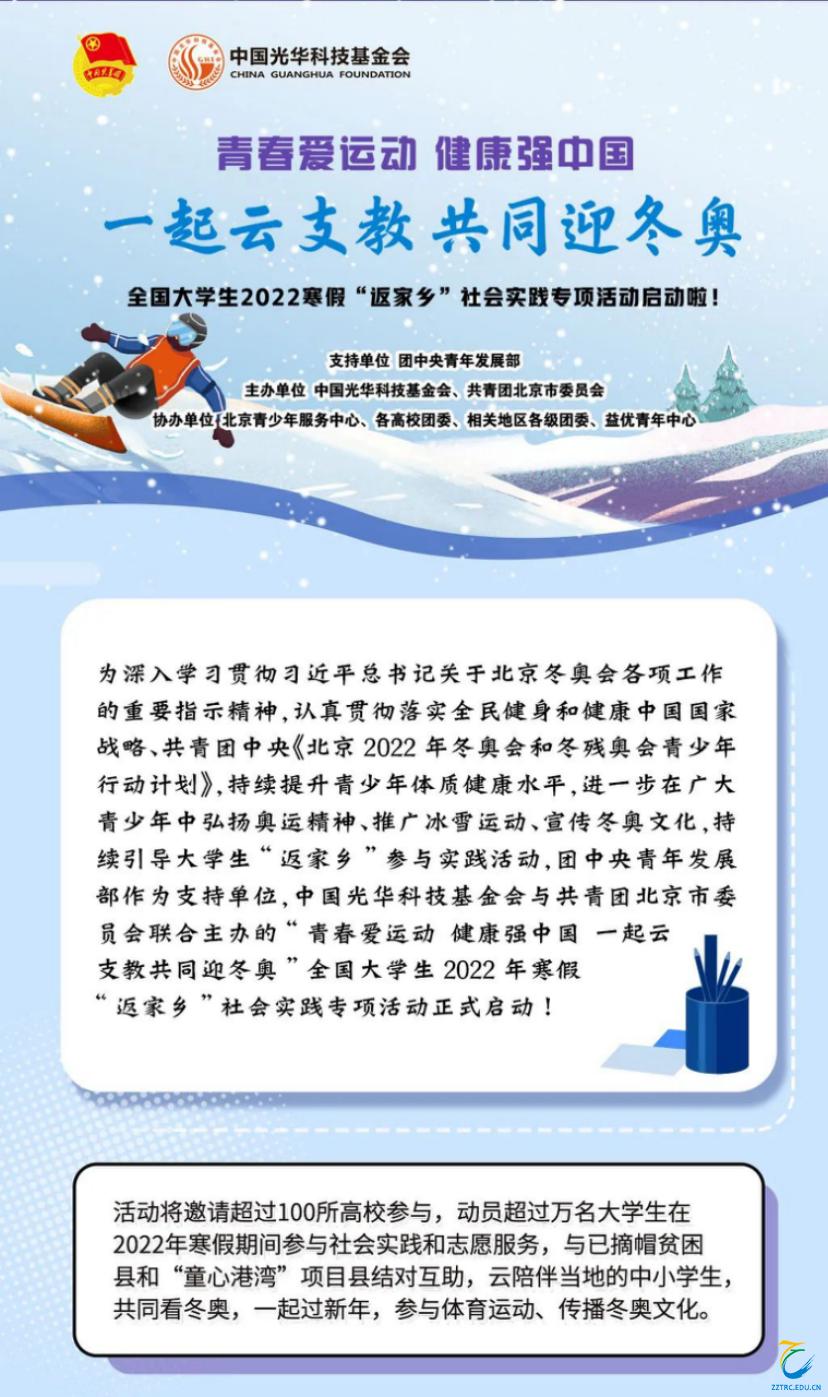 为进一步在广大青少年中弘扬奥运精神、推广冰雪运动、宣传冬奥文化,持续引导pp电子大学生“返家乡”参与实践活动,喜迎二十大、展现新时代青年风貌,现面向全校开展“青春爱运动 健康强中国 一起云支教 共同迎冬奥”2022年寒假“返家乡”社会实践专项活动。