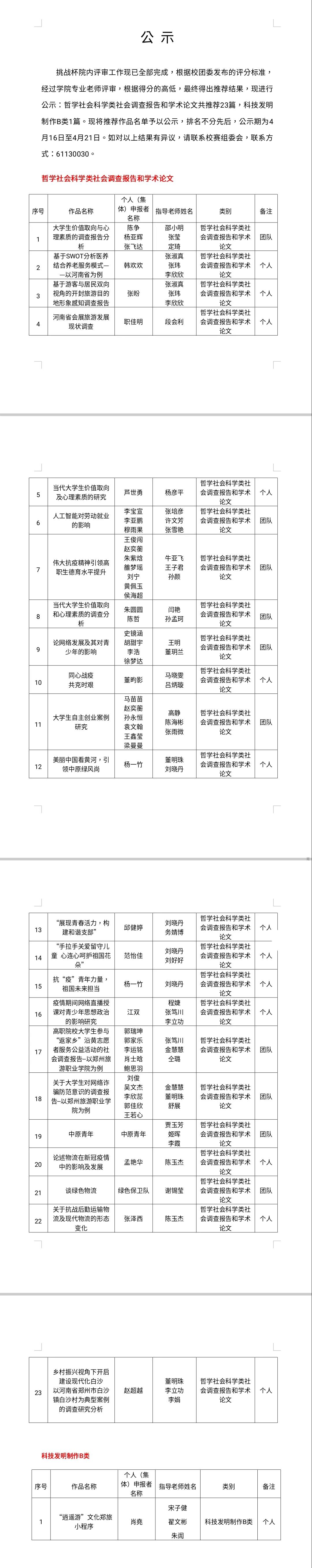 “挑战杯”校内评审工作已全部完成。按照评分标准和规则进行评审,根据得分高低评出一二三等,以此为依据分类评选出24件作品,推荐参加省赛,共推荐哲学社会科学类社会调查报告和学术论文23篇,科技发明制作B类1个。现将推荐作品予以公示,排名不分先后,公示期为4月16日——4月21日。如对以上结果有异议,请联系校赛组委会,联系方式:61130030。