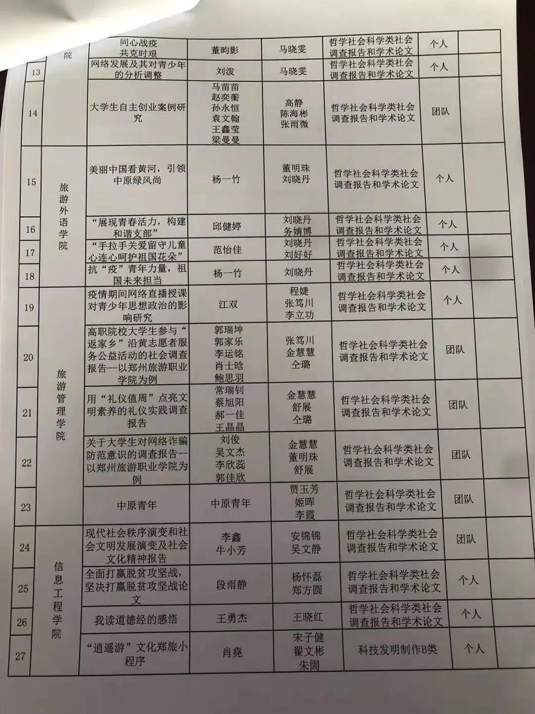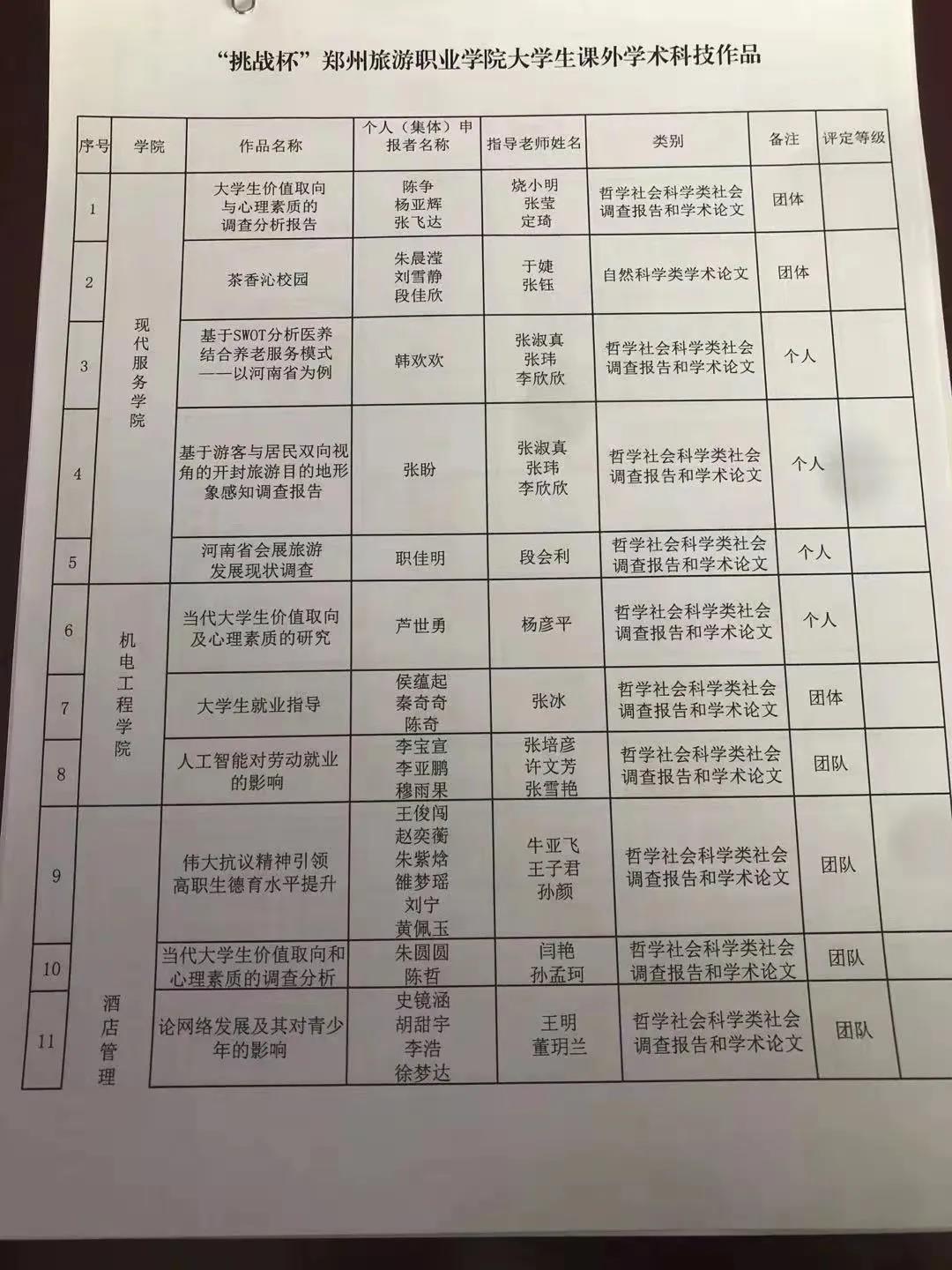 经过评选,哲学社会科学类社会调查报告和学术论文共推荐23篇,科技发明制作B类推荐1个,接下来组织网上填报,参加河南省决赛。“挑战杯”的举行对培养新时代经济社会发展需要的创新型人才注入驱动力,又对学校人才培养质量起到重要助推作用,促进学生成长成才。