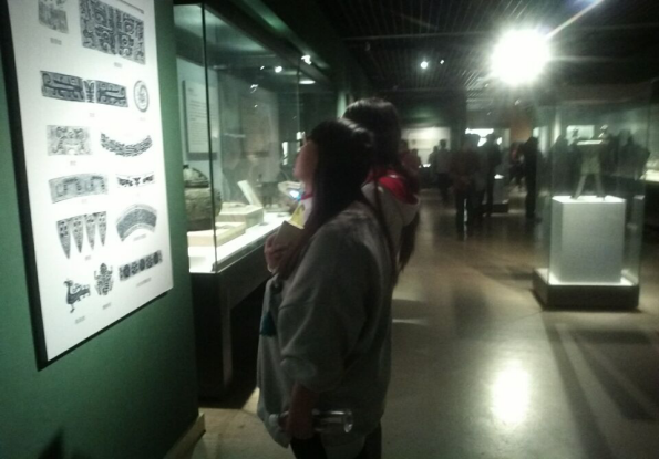 河南博物馆是一座国家级现代化博物馆,整体布局结构严谨,取九鼎定中原之寓意,建筑形式新颖别致,气势雄浑,充分体现了源远流长的中原文化特色。这引起了大家极大的兴趣,都想迫不及待地一睹博物馆的魅力和风采。我们虽还不能够透彻领悟整个博物院馆藏文物所蕴含的博大精深的文化内涵,但却真切感受到中华民族历史的源远流长,中原文化的辉煌灿烂。毕竟是我们河南的历史记载者,当我们到达目的地,所有团员进入馆内,当同学们看着那些尘土未落的石器和各种古容器,眼中无不呈现出对历史的崇畏,被古文明深深的吸引,心中更是激动,纷纷掏出手机拍照。当参观结束,我们在馆园门口合影来代表活动的结束。