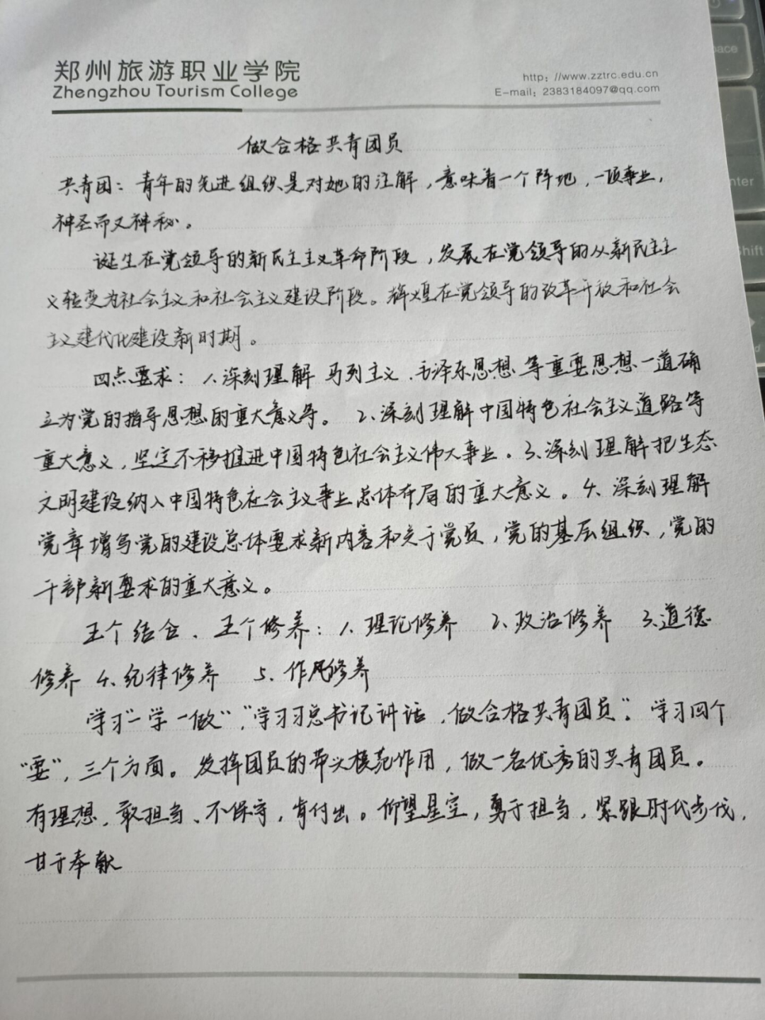 首先,金老师带领同学们重温历史,回顾“五四运动”、“一二·九运动”等团的重大历史事件。其次,带领同学们学习团章、“一学一做”即“学习党中央书记讲话,做合格共青团员”,“学”是并前提、是基础,“做”是着力点、落脚点,并向同学们提出“四个要求”、“五个结合”、“五个修养”。最后,金老师希望同学们做一个有理想,“仰望星空”、敢担当,勇于担当、不保守,紧跟时代步伐、肯付出,甘于奉献的共青团员。