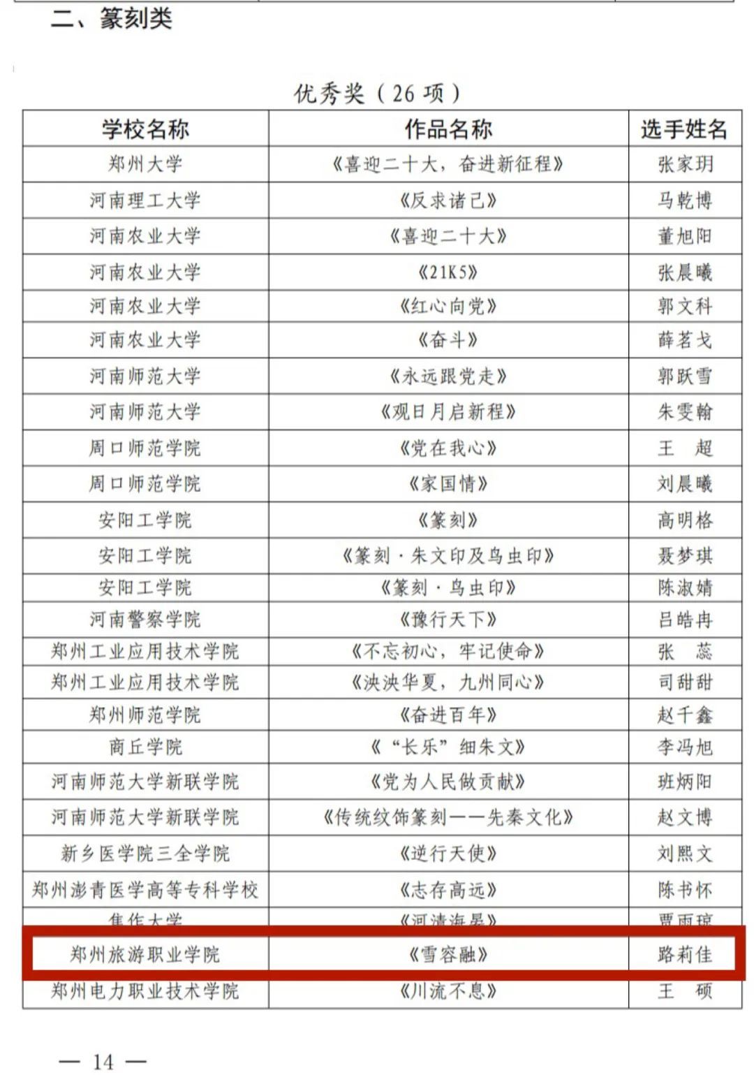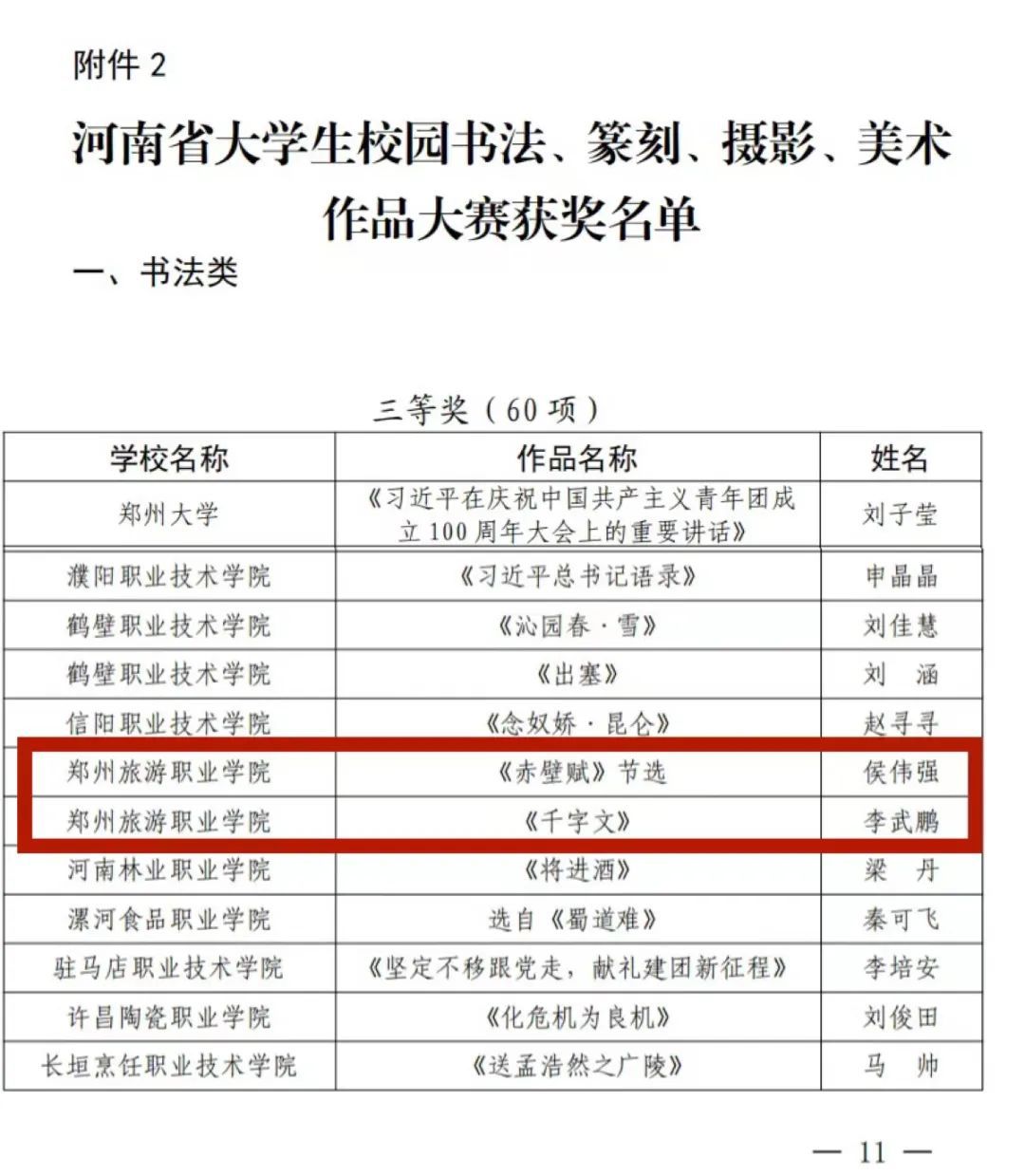 河南省大学生校园书法、篆刻、摄影、美术作品大赛获奖名单